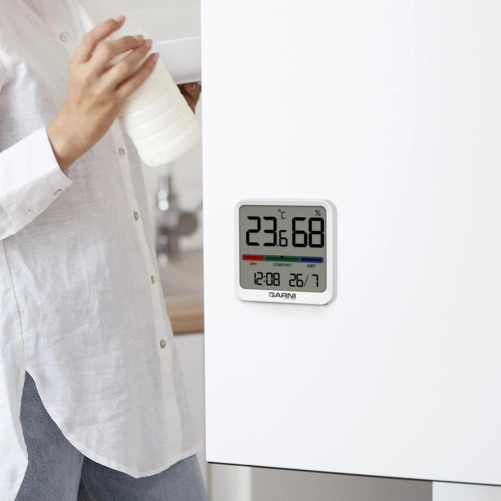Digitální teploměr s vlhkoměrem pro měření teploty a relativní vlhkosti v interiéru. Zobrazení času a data.
