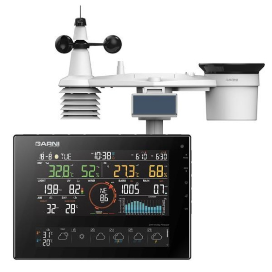 Integrované bezdrátové čidlo 7-v-1 GARNI 1NG měří vnější teplotu a relativní vlhkost, rychlost a směr větru, dešťové srážky, UV index a sluneční záření, a data jsou odesílána do hlavní jednotky až do vzdálenosti 150 m (v otevřeném prostoru). Napájení zajišťuje zajišťuje vestavěný kapacitor, který je nabíjen pomocí vestavěného solárního panelu. Baterie slouží jako záložní zdroj. Čidla jsou kompletně smontovaná a kalibrovaná tak, aby pro vás byla instalace co nejjednodušší. Hlavní jednotka je osazena snadno čitelným displejem VA displejem s ultračerným pozadím s možností automatické regulace jasu, který kromě dat ze všech připojených čidel (např. čidla pro měření teploty a relativní vlhkosti, bazénové čidlo, čidlo vlhkosti a teploty půdy, čidlo detekce blesků, čidlo kvality vzduchu) zobrazuje předpověď počasí, barometrický tlak, indexy počasí spolu s pokročilými funkcemi a informacemi, jako je výstražný alarm pro vysoké/nízké naměřené hodnoty a ztrátu spojení s čidly prostřednictvím notifikací v mobilní aplikaci a další. Vysokorychlostní procesor hlavní jednotky analyzuje naměřené hodnoty meteorologických veličin, vestavěná paměť uchovává maximální / minimální naměřené hodnoty za daný den nebo od počátku měření, a automaticky seřizuje čas a datum z internetu. Díky jednoduchému ovládání, snadné údržbě, možnosti kalibrace, zobrazení času východu a západu Slunce a Měsíce, zobrazení fází Měsíce, automatické regulaci jasu displeje, množství měřených veličin a dlouhodobé předpovědi se jedná o výjimečnou profesionální meteorologickou stanici pro váš domov.