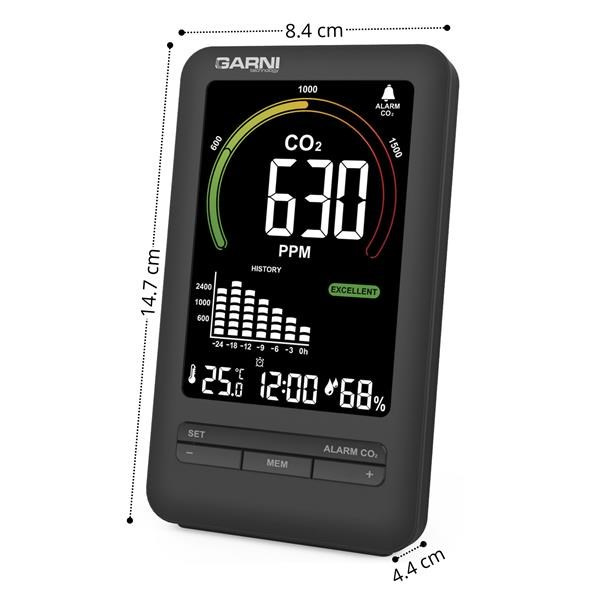 Měřič CO2 (kysličníku uhličitého) GARNI 206 OneCare je určen pro vnitřní použití. Měří a zobrazuje na svém barevném inverzním VA displeji hodnoty CO2 ve vzduchu a také teplotu a relativní vlhkost. Graf zobrazuje vývoj naměřené hodnoty CO2 za uplynulých 24 hodin. Pro měření CO2, teploty a relativní vlhkosti je použito fotoakustické čidlo SENSIRION řady SCD4x