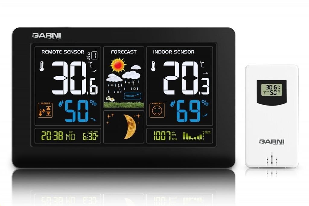 Meteorologická stanice se špičkovým inverzním barevným VA displejem s časem řízeným rádiovým signálem DCF-77, budíkem, měřením vnitřní teploty, relativní vlhkosti a absolutního barometrického tlaku, bezdrátovým čidlem pro měření vnější teploty a relativní vlhkosti a USB portem pro nabíjení externích zařízení inverzní barevný VA displej o rozměrech 167 x 93 mm s možností stálého osvětlení při napájení síťovým adaptérem, nebo krátkodobým osvětlením na 15 s při napájení bateriemi 4 stupně jasu osvětlení displeje, možnost vypnutí osvětlení displeje s možností krátkodobého osvětlení na 15 s (při napájení síťovým adaptérem) velikost číslic na displeji – čas, datum, barometrický tlak 8 mm, zkratka názvu dne 6 mm, vnitřní a vnější teplota 30 mm, vnitřní a vnější relativní vlhkost 20 mm čas a datum řízené signálem DCF-77 s možností manuálního nastavení ikona příjmu signálu DCF-77 zkratka názvu dne 12ti, nebo 24 hodinový formát zobrazení času možnost nastavení časového pásma od -12 do +12 hodin budík s funkcí opakovaného buzení (Snooze) po 5 minutách budící signál - 10 sekund 1 pípnutí za sekundu, 10 sekund 2 pípnutí za sekundu, 10 sekund 4 pípnutí za sekundu a poté stále 8 pípnutí za sekundu 6 animovaných ikon předpovědi počasí (slunečno, polojasno, oblačno, srážky, silný déšť a sněžení) na základě sledování barometrického tlaku vestavěným barometrickým čidlem zobrazení hodnot vnitřní a vnější teploty a relativní vlhkosti paměť na maximální a minimální naměřené hodnoty teploty a rel. vlhkosti s automatickým mazáním v 0:00 hodin měření absolutního barometrického tlaku (mb / hPa nebo inHg) šipky tendence vývoje absolutního barometrického tlaku, vnitřní a vnější teploty a rel. vlhkosti možnost nastavení alarmu horní a dolní meze venkovní teploty v rozsahu od -20°C do +60°C (akustickým signálem a ikonou na displeji) pro každý kanál zvlášť s indikací námrazy v rozsahu od -1°C do +3°C zobrazení teploty ve °C, nebo °F možnost použití až 3 bezdrátových čidel GARNI 30H (jedno čidlo GARNI 030H je součástí dodávky) funkce automatického přepínání kanálů 5 ikon vnitřní tepelné pohody bezdrátový přenos hodnot vnější teploty a relativní vlhkosti na frekvenci 433 MHz ikona příjmu signálu bezdrátového čidla zobrazení fáze Měsíce USB port pro nabíjení mobilních zařízení (pouze při napájení hlavní jednotky síťovým adaptérem), maximální nabíjecí proud 1 000 mA ikony slabých baterií napájení síťovým adaptérem nebo bateriemi možnost postavení, nebo zavěšení barva černá Bezdrátové čidlo GARNI 030H vlhkosti odolné displej o rozměrech 19 x 11 mm velikost číslic na displeji: teplota a relativní vlhkost 4 mm měření teploty a relativní vlhkosti 3 kanály maximální RF výkon 10 dBm (10 mW) možnost postavení a zavěšení barva bílá Obsah balení: 1 x hlavní jednotka GARNI 545 Line 1 x bezdrátové čidlo GARNI 030H 1 x síťový adaptér český, slovenský, německý, anglický, italský, polský a maďarský návod.