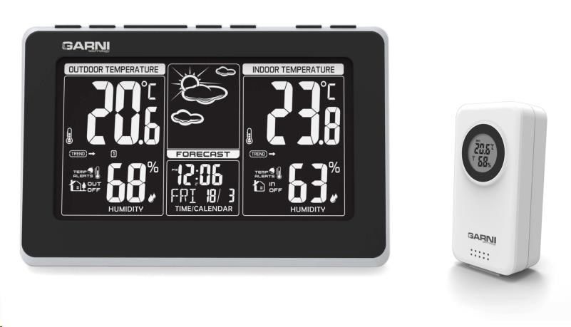 Meteorologická stanice s inverzním LCD displejem s časem řízeným rádiovým signálem DCF-77, budíkem, měřením vnitřní teploty a relativní vlhkosti, bezdrátovým čidlem pro měření vnější teploty a relativní vlhkosti a USB portem pro napájení externích zařízení. Mobilní telefon a USB kabel nejsou součástí balení - inverzní LCD displej o rozměrech 169 x 94 mm s možností stálého osvětlení při napájení síťovým adaptérem, nebo krátkodobým osvětlením na 8 s při napájení bateriemi - dva stupně jasu osvětlení displeje, možnost vypnutí osvětlení displeje (při napájení síťovým adaptérem) - při napájení pouze bateriemi lze displej rozsvítit zvukem, např. klepnutím, tlesknutím apod. - velikost číslic na displeji – čas 12,5 mm, datum a zkratka názvu dne 8 mm, vnitřní a vnější teplota 38 mm, vnitřní a vnější relativní vlhkost 23 mm - čas řízený signálem DCF-77 s možností manuálního nastavení - ikona příjmu signálu DCF-77 - 12ti, nebo 24 hodinový formát zobrazení času - možnost nastavení časového pásma od -12 do +12 hodin - budík s 2 budícími časy s funkcí opakovaného buzení (Snooze) nastavitelného od 3 do 20 minut - budící signál - 10 sekund 1 pípnutí za sekundu, 10 sekund 2 pípnutí za sekundu a poté stálé 4 pípnutí za sekundu - 13 ikon předpovědi počasí v 6 úrovních (jasno, polojasno, oblačno, déšť, bouřky a sněžení) na základě sledování barometrického tlaku vestavěným barometrickým čidlem - zobrazení hodnot vnitřní a vnější teploty a relativní vlhkosti - šipky tendence vývoje vnitřní a vnější teploty - možnost nastavení alarmu horní a dolní meze vnitřní a vnější teploty (akustickým signálem a ikonou na displeji) - zobrazení teploty ve °C, nebo °F - možnost použití až 3 bezdrátových čidel GARNI 040H (jedno je součástí dodávky) - funkce automatického přepínání kanálů - bezdrátový přenos hodnot vnější teploty relativní vlhkosti na frekvenci 433 MHz - ikona příjmu signálu bezdrátového čidla - USB port pro nabíjení mobilních zařízení (pouze při napájení hlavní jednotky síťovým adaptérem), maximální nabíjecí proud 1 000 mA - napájení síťovým adaptérem nebo bateriemi - možnost postavení, nebo zavěšení - barva černá se stříbrnou Bezdrátové čidlo GARNI 040H - vlhkosti odolné, krytí IP44 (odolné proti stříkající vodě) - kruhový displej o průměru 19 mm - velikost číslic na displeji: teplota a relativní vlhkost 5 mm - měření teploty a relativní vlhkosti - 3 kanály - maximální RF výkon 10 dBm (10 mW) - možnost postavení a zavěšení - barva bílá Obsah balení: 1 x hlavní jednotka GARNI 560 EASY II 1 x bezdrátové čidlo GARNI 040H 1 x síťový adaptér český, slovenský, německý, anglický, polský a maďarský návod.