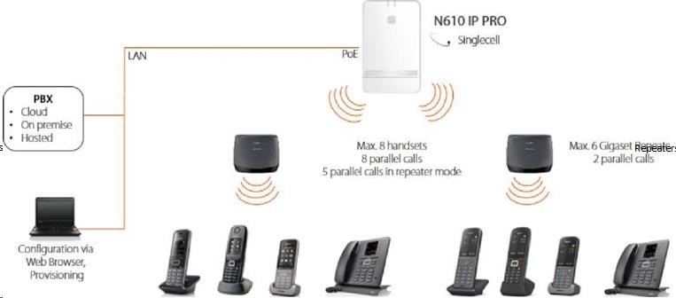 The N610 IP DECT base station is interoperable with many platforms and network providers. All recent professional handsets from Gigaset are compatible with N610 and integrate smoothly. Connect up to 8 handsets and up to 6 DECT repeaters to increase the range of the handsets.