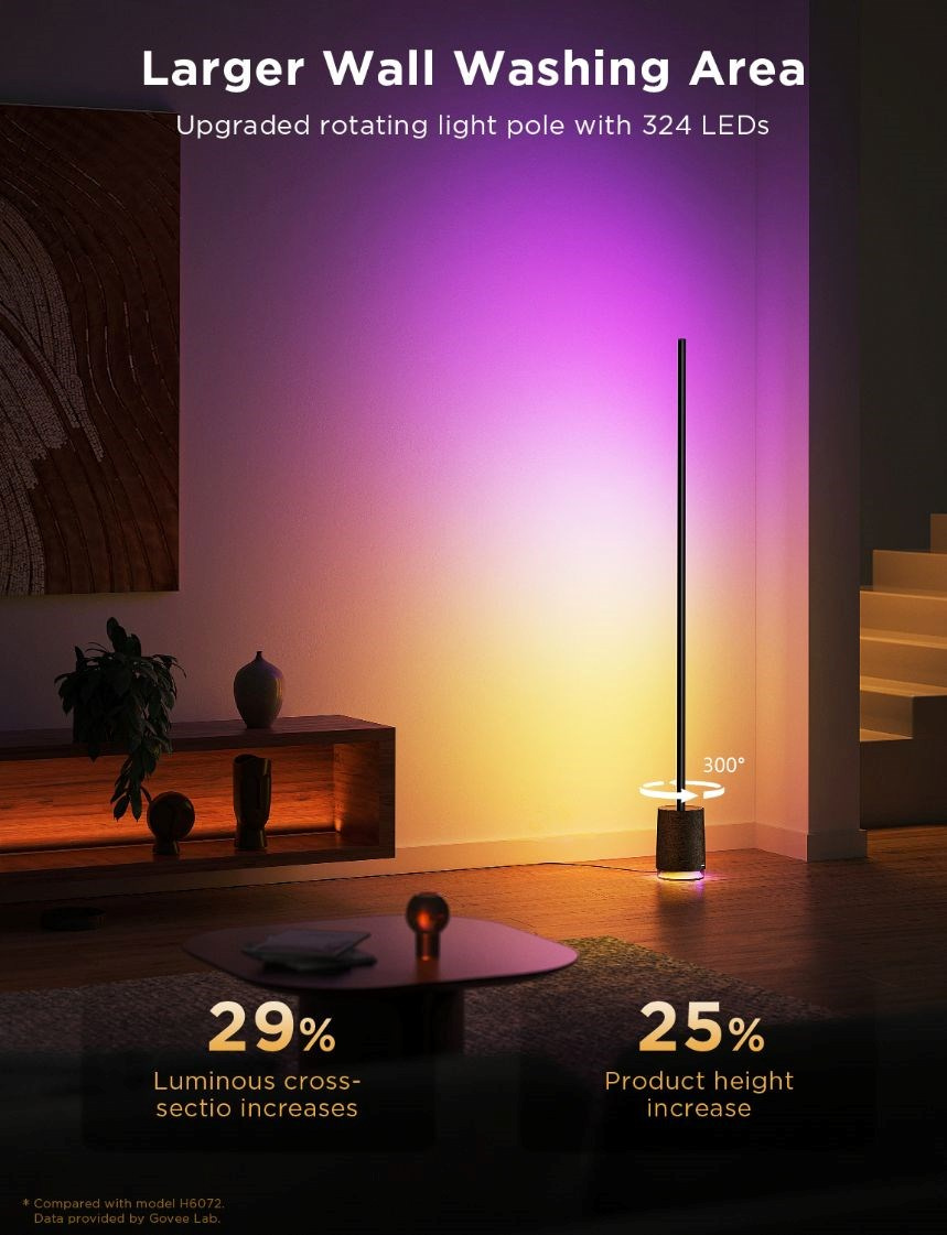 Govee Floor Lamp Pro vychází z modelu Lyra. Je to minimalistická, moderní podlahová lampa s BT reproduktorem, která poskytne dokonalou podívanou a perfektní zvukový zážitek. Lampa nabízí velmi slušných 2100 lumenů. Díky 324 diodám s technologií 4 v 1 RGBICWW, které lze rozdělit až na 54 nezávisle programovatelných segmentů dokáže lampa předvádět efektní podívanou jako perfektní barevné přechody, složité barevné vizualizace a skvělý jas a kontrast. dosahuje světlo ohromující intenzity. K dispozici je přes 16 milionů barev nebo bílá laditelná od 2200 do 6500 K. Floor Lamp Pro je také vybavena BT reproduktorem, takže k ní můžete připojit svůj telefon nebo TV a využít ji k přehrávání hudby nebo filmů. Dodatečně je lampa vybavena 29 presety bílého šumu, který vám pomůže se soustředěním, relaxací nebo usnutím. S funkcí DreamView můžete lampu synchronizovat s dalšími Govee světly a jedním stiskem tak tvořit atmosféru pro každou příležitost. Lampa měří 172 cm, ale zabírá minimální prostor a lze ji tak umístit doslova kamkoliv. Nejvíce jí to však sluší v rohu nebo u zdi, kde osvítí maximální prostor za sebou a vykouzlí na vaše zdi úžasně plynulé barevné přechody. Životnost lampy je u Govee standardních 25.000 hodin. Ovládání je možné aplikací Govee Home, Google Home, pomocí asistentů Google, Apple i Amazon. Pro maximální pohodlí v balení naleznete i klasický dálkový ovladač, který je kdykoliv v pohotovosti, připnutý přímo k lampě. Samozřejmostí jsou přednastavené scény, kterých je zde 81, několik režimů synchronizace s hudbou a pokud si ani tak nevyberete, čeká na vás DIY režim, který vám dá 100% kontrolu při které je jediný limit vaše fantazie.
