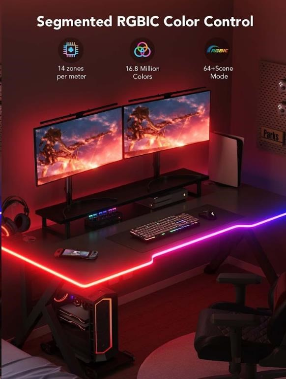 Světelný pásek Govee Neon Gaming Table Light nabízí více než 64 různých režimů pro dokonalé naladění světelné atmosféry. Govee technologie RGBIC umí zobrazit až 57 barev najednou z celkové škály 16 milionů barev při intenzitě 1-100%. Může se také pochlubit životností až 50.000 hodin.