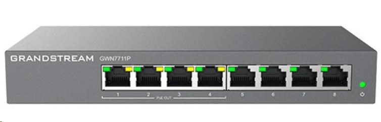 GWN7711P podporuje VLAN pro flexibilní a sofistikovanou segmentaci provozu, QoS pro upřednostňování síťového provozu, IGMP Snooping pro optimalizaci výkonu sítě a komplexní možnosti zabezpečení proti potenciálním útokům. GWN7711P lze snadno spravovat prostřednictvím místního webového uživatelského rozhraní a cloudu pomocí systému správy zařízení Grandstream (GDMS). Díky komplexní sadě přizpůsobitelných přepínacích funkcí, dostupnému pasivnímu PoE režimu 24V DC a snadné správě cloudu jsou řady GWN7711(P) ideálními spravovanými síťovými přepínači pro malá až středně velká nasazení. GWN7711P poskytuje 4 porty PoE pro inteligentní dynamický výstup PoE pro napájení IP telefonů, IP kamer, přístupových bodů Wi-Fi a dalších koncových bodů PoE. Tento model s podporou PoE může také podporovat 24V DC pasivní režim PoE-out.