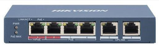 Popis HIKVISION DS-3E0106HP-E switch 1x 100TX HI-PoE + 3x 100TX PoE; 2x 100TX uplink, 60W, Super PoE