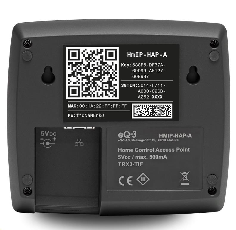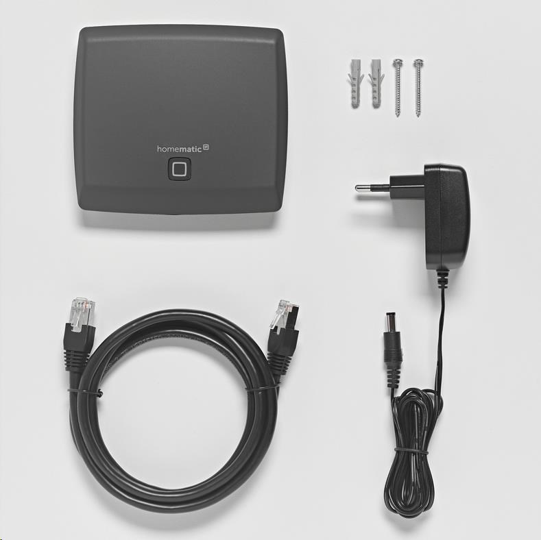 Centrální jednotka (HmIP-HAP-A) je připojena ke standardnímu routeru ethernetovým kabelem (RJ-45) a slouží jako rozhraní mezi cloudem Homematic IP umístěným výhradně na serverech v Německu a zařízeními Homematic IP ve vaší domácnosti.