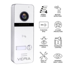 Vstupní kamerova jednotka VERIA 301. Kamerová jednotka snímá obraz ve Full HD rozlišení a má ovládání el.zámku. Disponuje vestavěnou čtečkou RFID čipů 13,56 MHz. Kompatibilní s monitory Veria řady 3xxx..