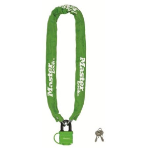 Zpevněný ocelový řetěz s ocelovým visacím zámkem je 90 cm dlouhý a obsahuje ocelové spojky o průměru 6 mm, které odolávají řezání. Nylonový kryt zabraňuje poškrábání. 2 ks klíčů jsou součástí balení. Barva zelená. Cena za kus..