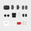 Battery life is built for long days. The transmitters last up to 9 hours on a single charge, and the included charging case provides up to two full recharges—offering around 27 hours of total use without needing a power outlet. Setup is automatic: just connect the receiver, and you’re ready to record or livestream.