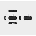 The kit includes both a camera-mount receiver (3.5 mm TRS + USB-C out) and a USB-C receiver. The pack also supports real-time wireless monitoring (with optional OWS earphones) and offers up to 36 hrs runtime from the included charging case. Connectivity extends to both cameras and mobile devices, with lightning adapters included.