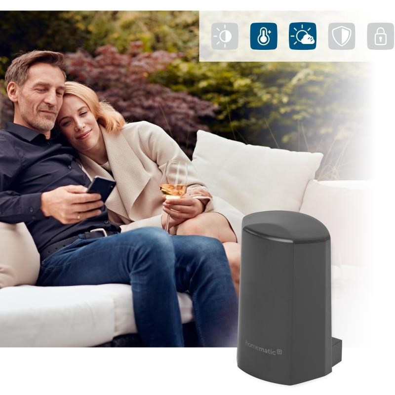 Kompaktní senzor s krytím proti nepřízni počasí a povětrnostním vlivům nabízí široké možnosti využití ve spojení s dalšími zařízeními systému Homematic IP. Zařízení monitoruje venkovní teplotu a relativní vlhkost. Naměřené hodnoty následně předává Centrální jednotce (HmIP-HAP) a připojeným zařízením Homematic IP, která reagují podle předem definované konfigurace.
