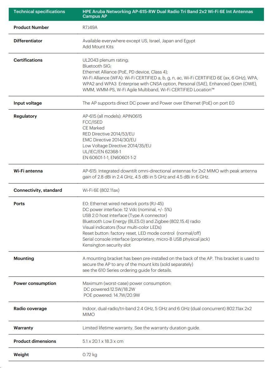 | Aruba AP-615 (RW) Dual-radio Tri-band 2x2:2 802.11ax Wi-Fi 6E Internal Antennas Campus AP | R7J49A |