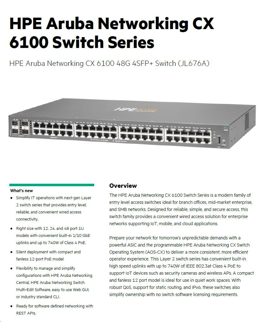 Popis HPE Aruba Networking CX6100 48G 4SFP+ Switch