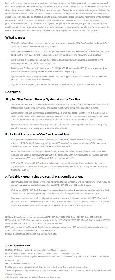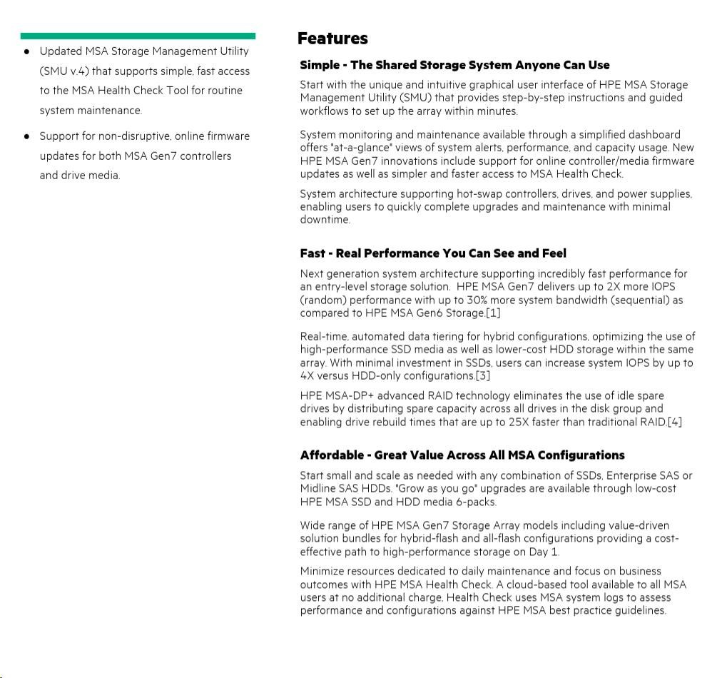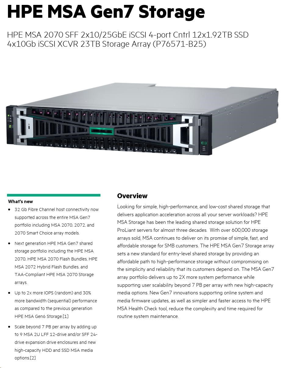 Popis HPE MSA 2070 SFF 2x10/25GbE iSCSI 4-port Cntrl 12x1.92TB SSD 4x10Gb iSCSI XCVR 23TB Storage Array Smart Choice
