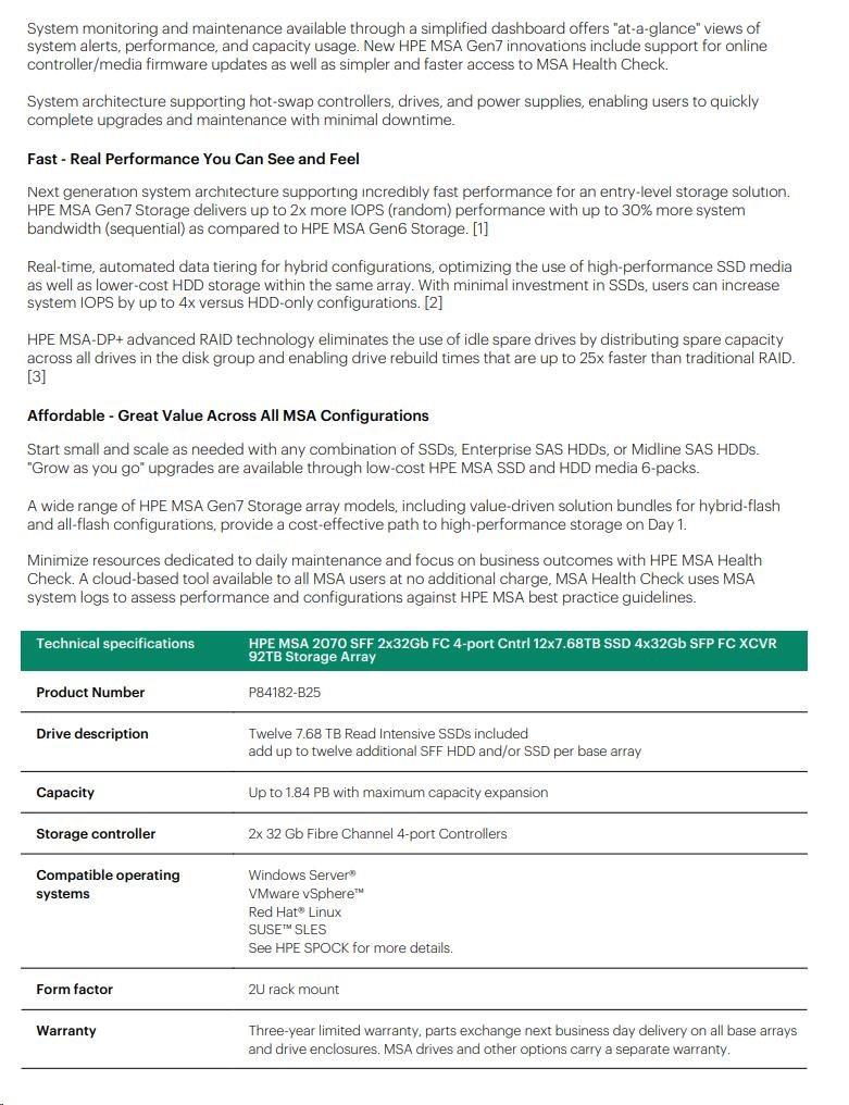 HPE MSA 2070 SFF 2x32Gb FC 4-port Controller 12x7.68TB SSD 4x32Gb SFP FC XCVR 92TB Storage Array Smart Choice