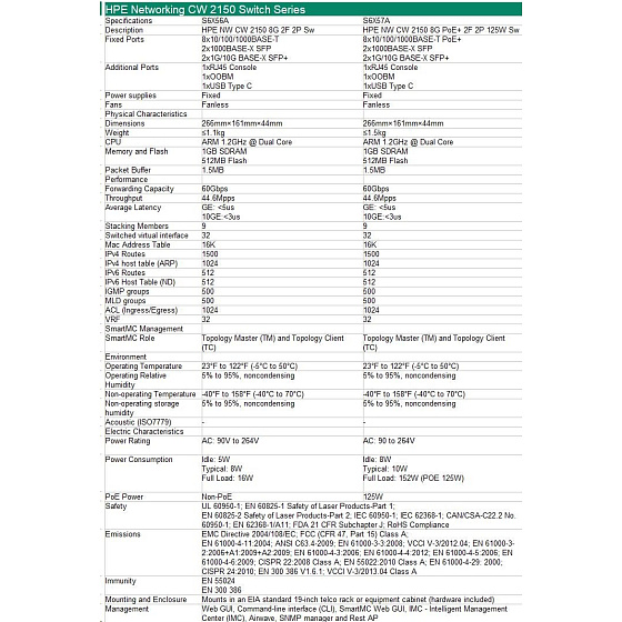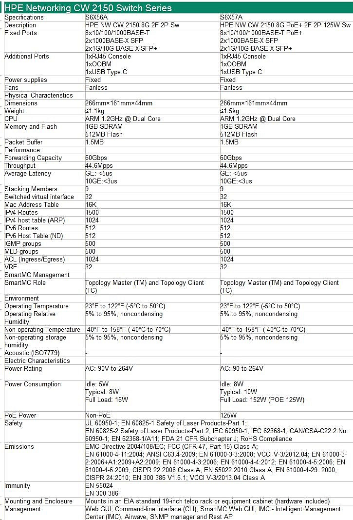 HPE Networking CW 2150 8p 10M/100M/1G 2p SFP 1G 2p SFP+ 1G/10G Switch