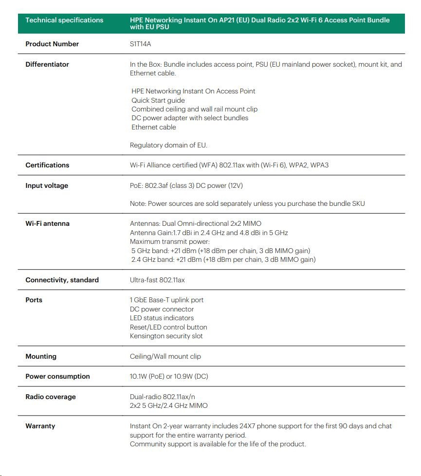 HPE Networking Instant On AP21 (EU) Dual Radio 2x2 Wi-Fi 6 Access Point Bundle with EU PSU