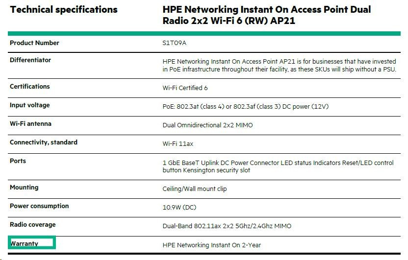 Differentiator HPE Networking Instant On Access Point AP21 is for businesses that have invested in PoE infrastructure throughout their facility, as these SKUs will ship without a PSU.