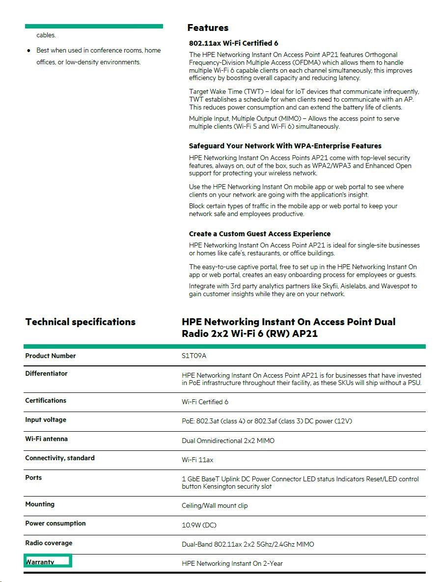 The HPE Networking Instant On Access Point AP21 features Orthogonal Frequency-Division Multiple Access (OFDMA) which allows them to handle multiple Wi-Fi 6 capable clients on each channel simultaneously; this improves efficiency by boosting overall capacity and reducing latency. Target Wake Time (TWT) – Ideal for IoT devices that communicate infrequently, TWT establishes a schedule for when clients need to communicate with an AP. This reduces power consumption and can extend the battery life of clients. Multiple Input, Multiple Output (MIMO) – Allows the access point to serve multiple clients (Wi-Fi 5 and Wi-Fi 6) simultaneously.