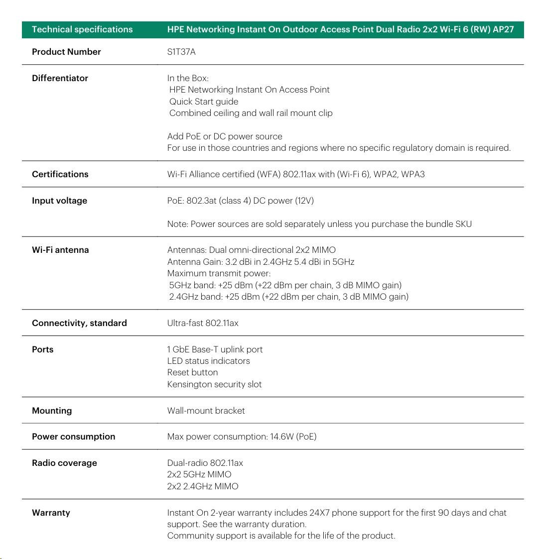 The HPE Networking Instant On Access Point AP27 is a dual radio outdoor access point designed to keep your employees and customers productive outdoors. This Wi-Fi CERTIFIED 6™ access point supports up to 75 simultaneous users and offers modern Wi-Fi standards in a robust, tough casing. These dual-band omni-directional radios offer impressive range and the same great features as other enterprise-class access points, but without any ongoing subscription fees. The AP27 features integrated wall- or pole-mounting brackets in a ruggedized casing for flexible mounting configurations in outdoor environments. The AP27 offers Power over Ethernet (PoE) 802.3af (Class 4) with a fully-integrated management experience in the Instant On mobile app or web portal.