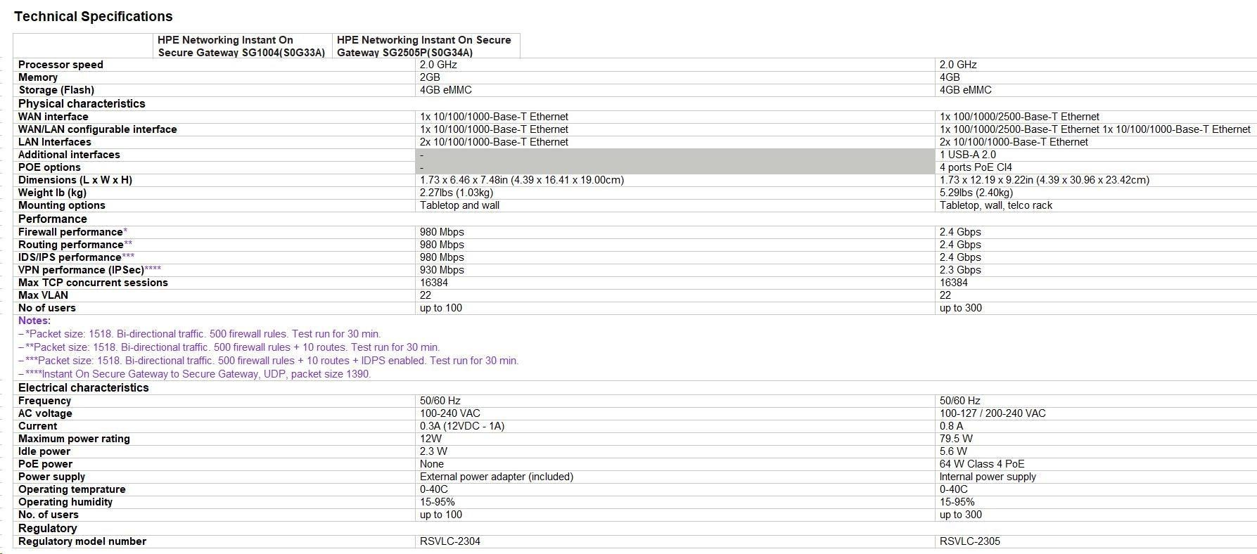 | Notes: - *Packet size: 1518. Bi-directional traffic. 500 firewall rules. Test run for 30 min. - **Packet size: 1518. Bi-directional traffic. 500 firewall rules + 10 routes. Test run for 30 min. - ***Packet size: 1518. Bi-directional traffic. 500 firewall rules + 10 routes + IDPS enabled. Test run for 30 min. - ****Instant On Secure Gateway to Secure Gateway, UDP, packet size 1390. | ||