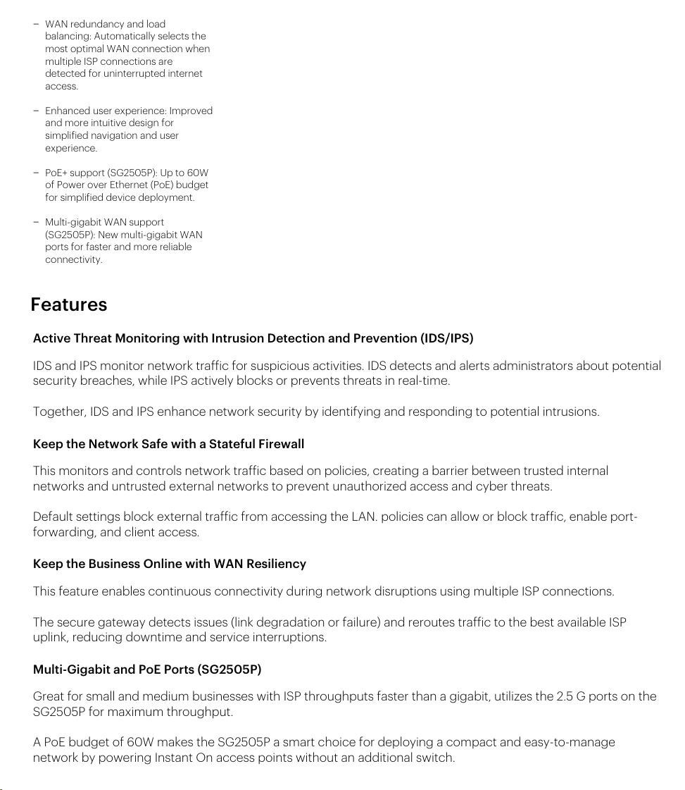 The HPE Networking Instant On Secure Gateways deliver a wide range of advanced technical features designed to boost network performance and enhance security for SMBs. One key feature is VPN, which provides encrypted site-to-site communication between Instant On Secure Gateway sites, allowing businesses to connect multiple locations more securely. Additionally, the built-in Intrusion Detection and Prevention System (IDS/IPS) actively monitors network traffic for suspicious activity and automatically blocks malicious content threats, ensuring the integrity of business data. And with automatic firmware updates that keep security patches up to date and easy-to-use management through the Instant On cloud portal and mobile app, maintaining a more secure network has never been easier. The gateway also supports WAN resiliency through failover features, ensuring continuous network service even during ISP outage events.
