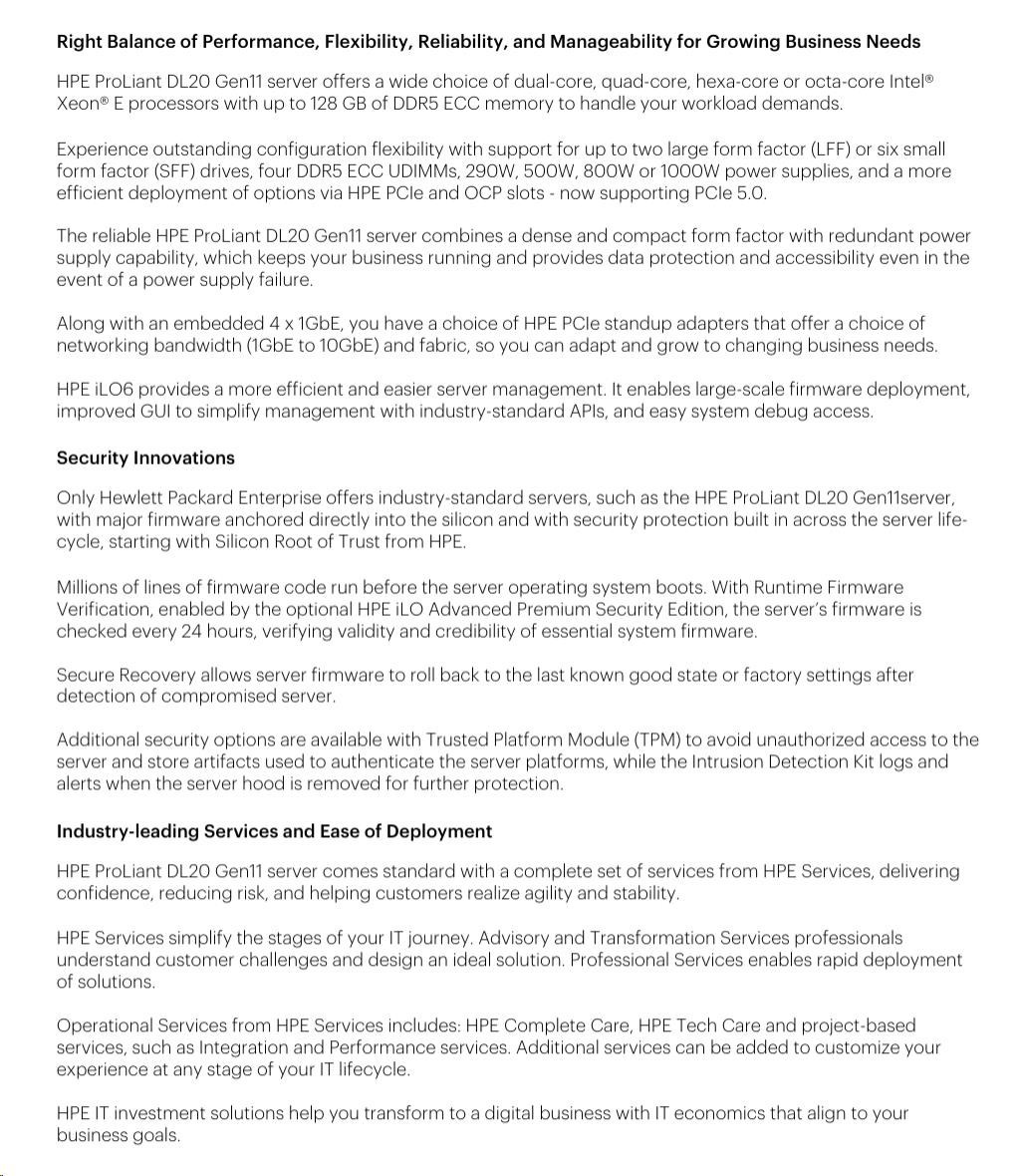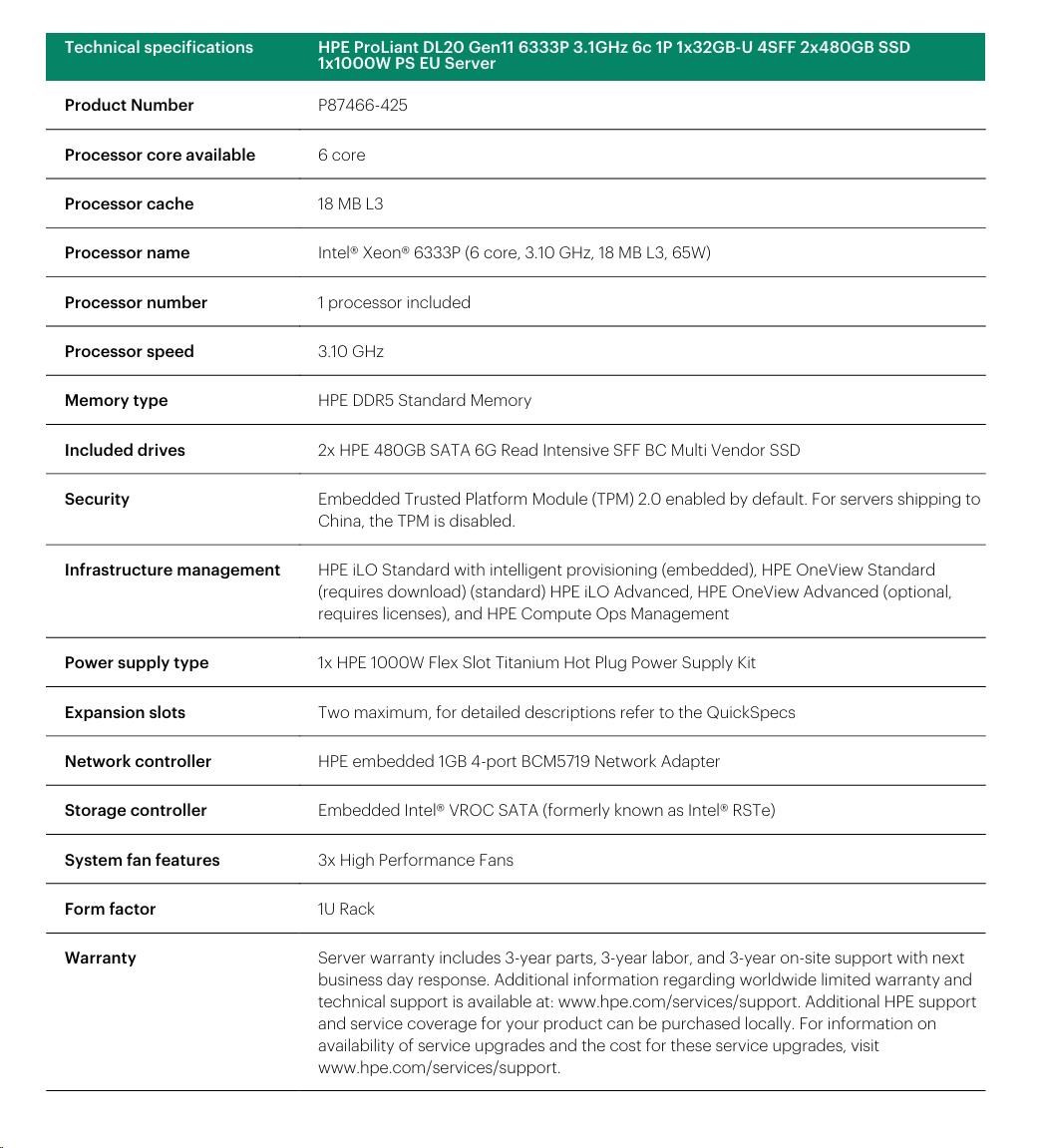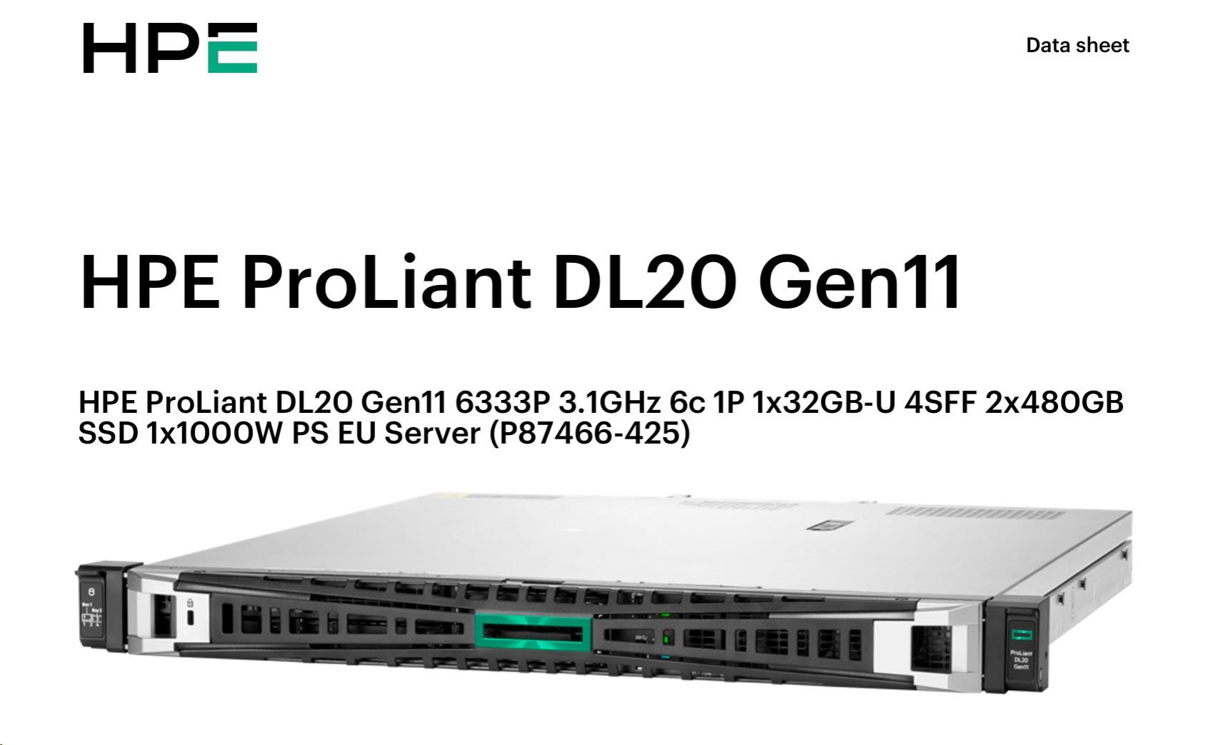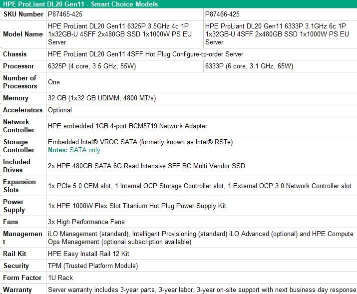 Popis HPE PL DL20g11 6333P (3.1G/6C12T) 1x32G 2x480GB VROC 4SFF 1x1000W 4x1G NBD333 Smart Choice
