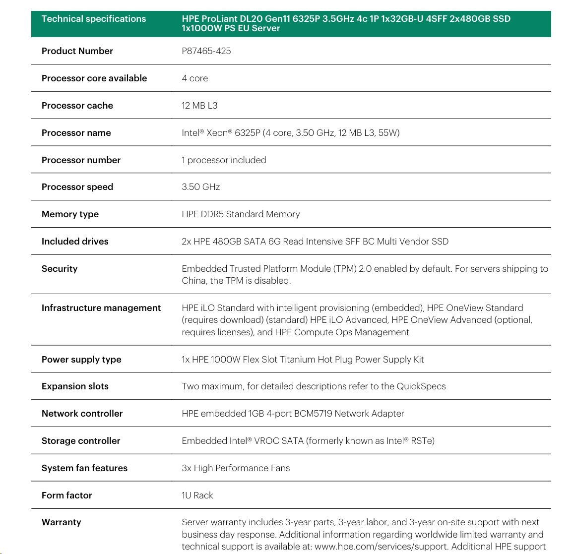 Popis HPE PL DL20g11 6325P (3.5G/4C8T) 1x32G 2x480G SSD VROC 4SFF-HP 4p1Gb 1x1000W Smart Choice