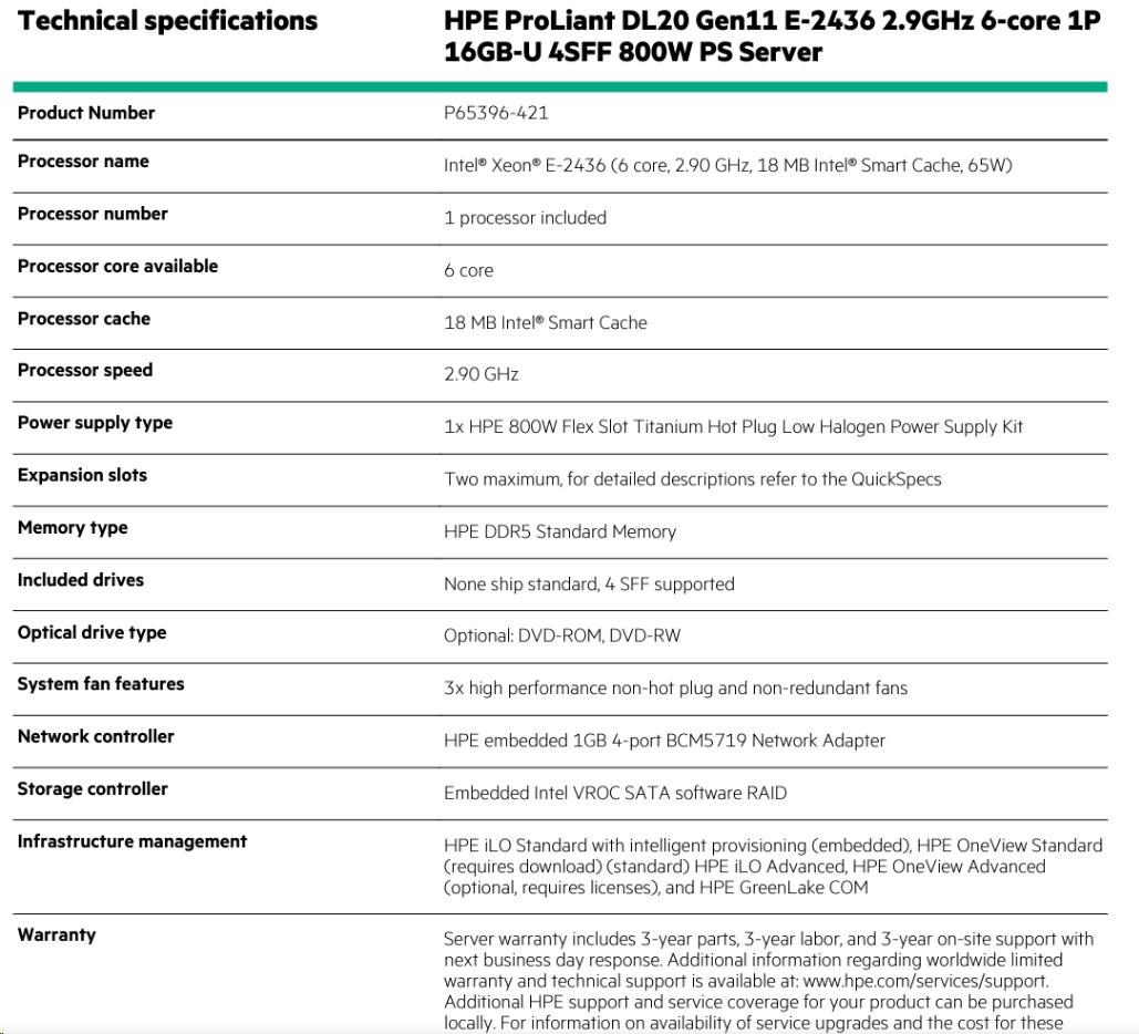 HPE PL DL20g11 E-2436 (2.9G/6C) 16G (P64336) 4-6SFF VROC 800W 4x1G NBD333
