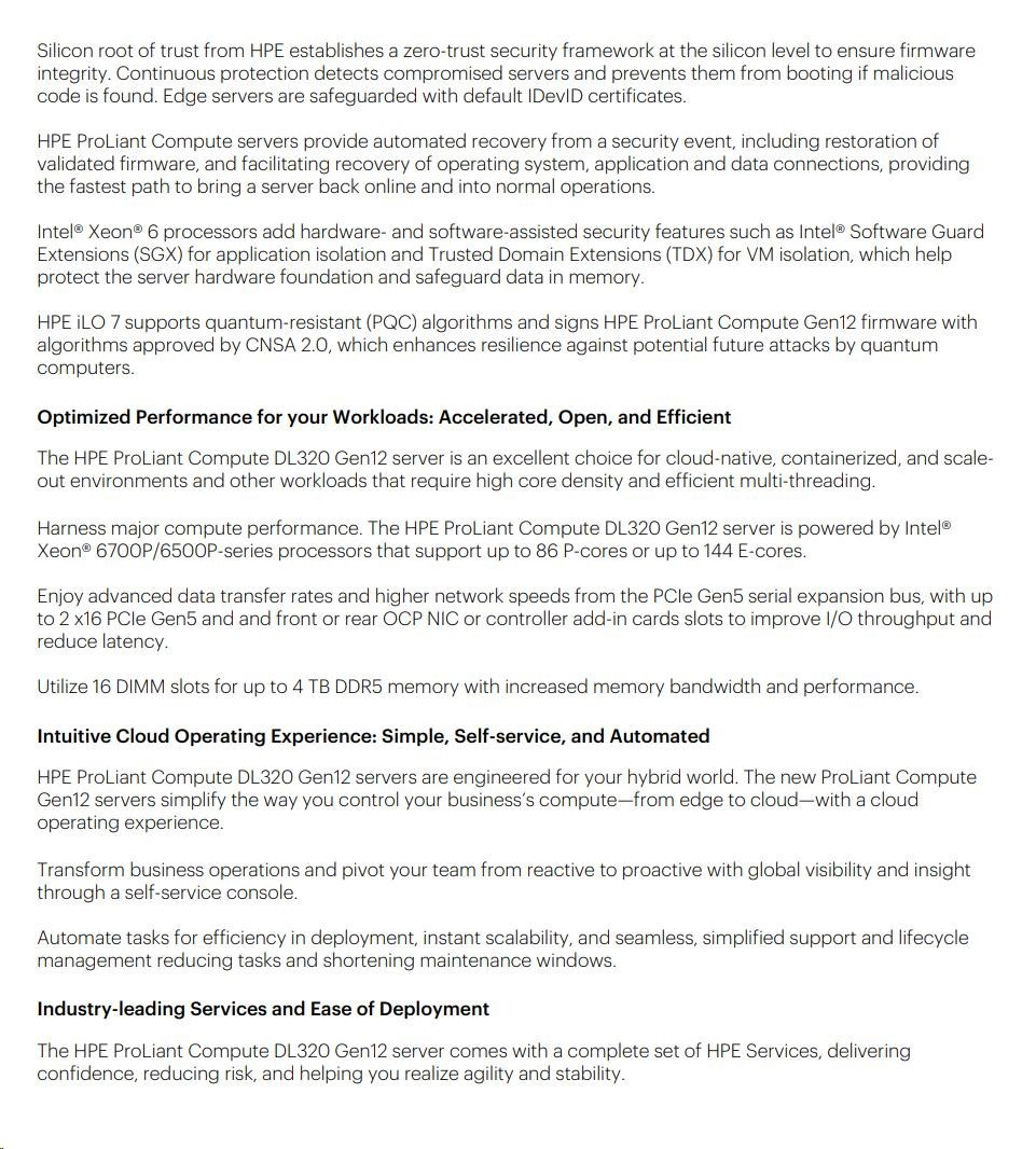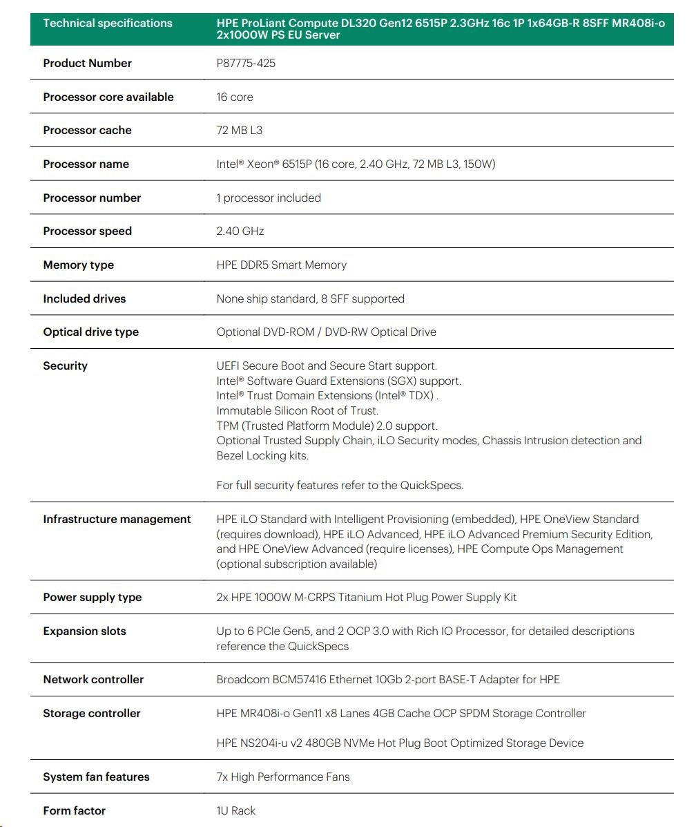 Popis HPE PL DL320g12 6515P (2.4/16C) 1x64G (P69728) MR408i-o 8SFF NS204(2x480G) 2x1000W 10GbE NBD333 Smart Choice