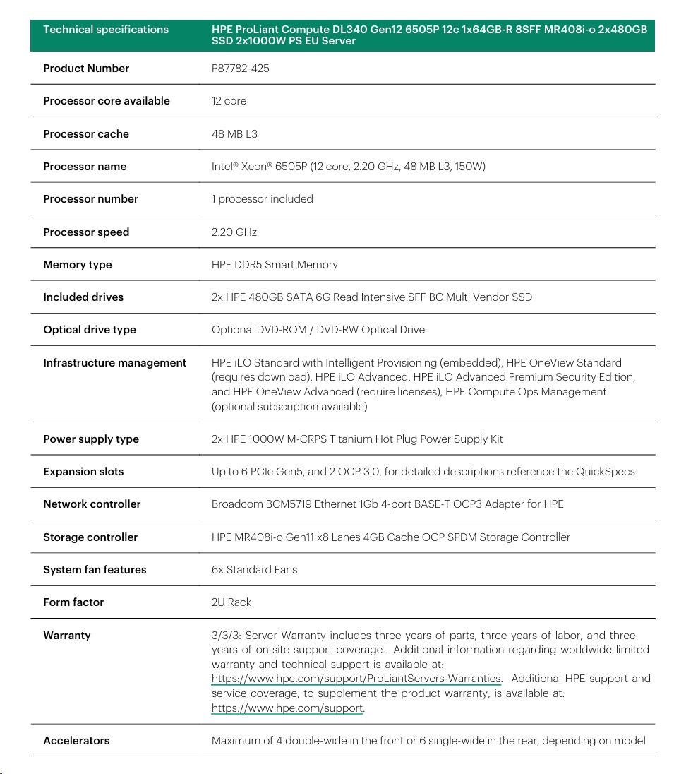 Popis HPE PL DL340g12 6505P (2.2/12C) 1x64G (P69728) 2x480G MR408i-o 8SFF 2x1000W 1GbE NBD333 Smart Choice