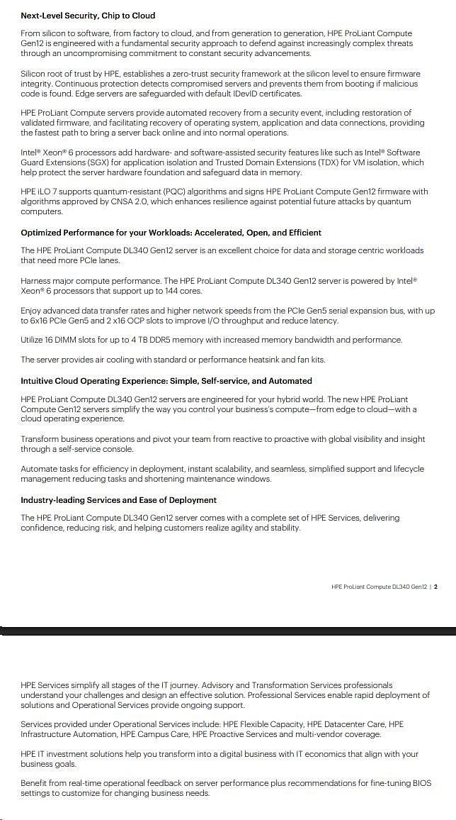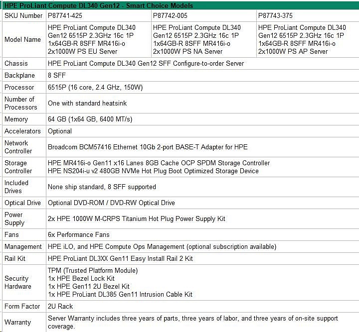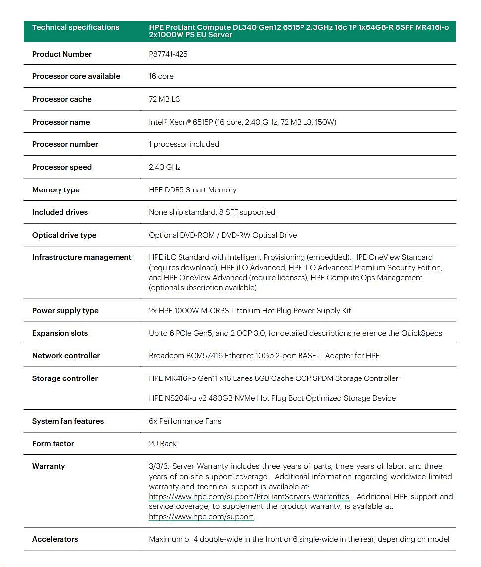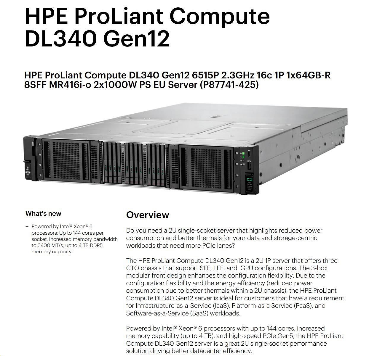 Popis HPE PL DL340g12 6515P (2.4/16C) 1x64G (P69728) NS204(2x480) MR416i-o 8SFF 2x1000W 2p10Gsfp+ PerfFans NBD333 Smart Choice
