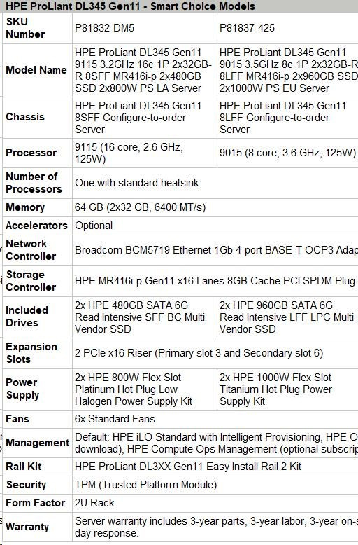 Popis HPE PL DL345g11 AMD Epyc 9015 (3.6G/8C) 2x32G (P64985) 2x960G 2x1000W MR416i-p 8LFF 4p1G Smart Choice