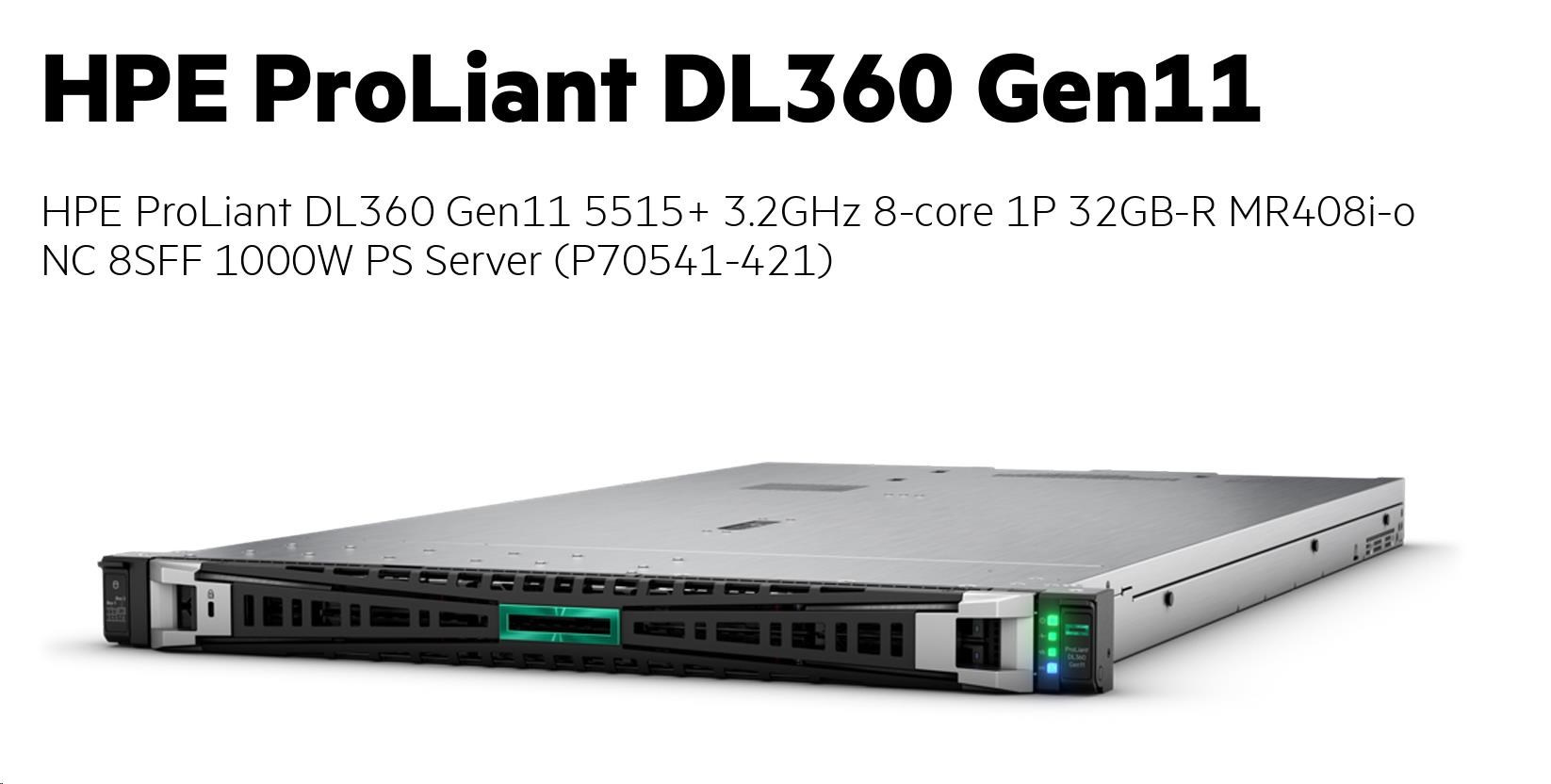 HPE PL DL360g11 5515+ (3.2/8C/165W) 1x32G (p64706) MR408i-o/4G 8-10SFF 1x1000W 2x10G-T NBD333 1U P70541-421 RENEW