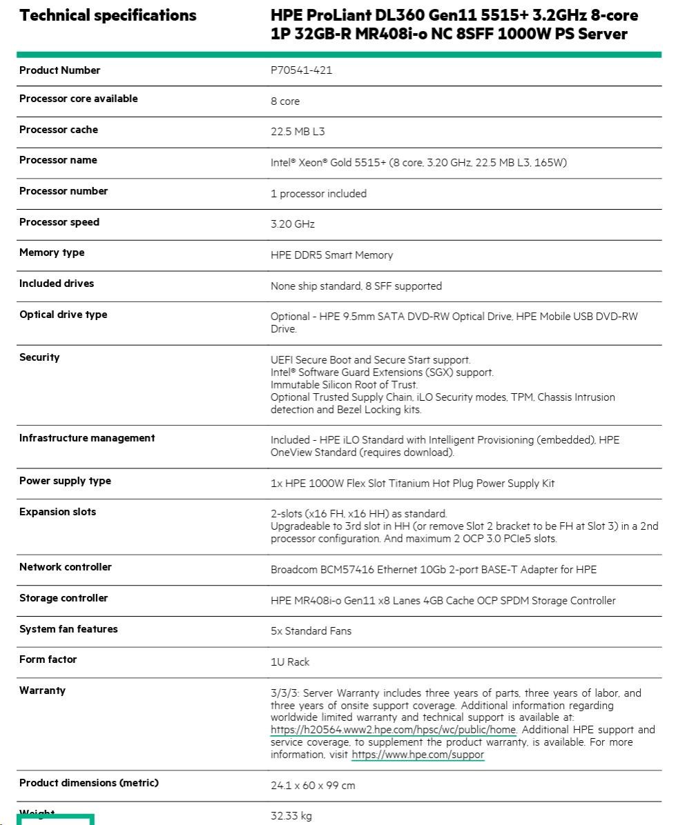 Model Name HPE PL DL360g11 5515+ (3.2/8C/165W) 1x32G MR408i-o/4G 8-10SFF 1x1000W 2x10G-T NBD333 1U