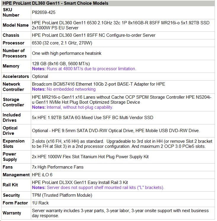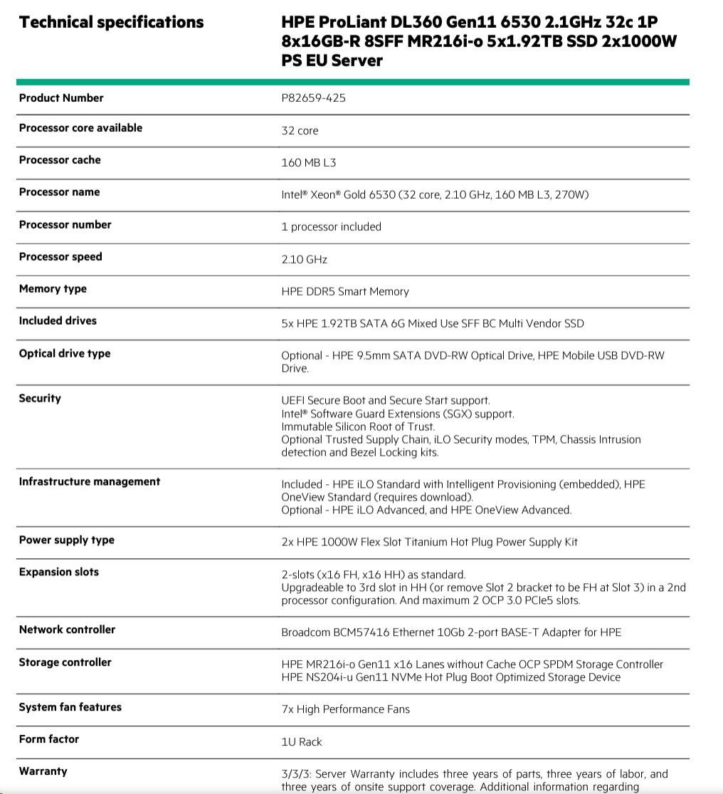 Product Number P82659-425 Processor core available 32 core Processor cache 160 MB L3 Processor name Intel® Xeon® Gold 6530 (32 core, 2.10 GHz, 160 MB L3, 270W) Processor number 1 processor included Processor speed 2.10 GHz Memory type HPE DDR5 Smart Memory Included drives 5x HPE 1.92TB SATA 6G Mixed Use SFF BC Multi Vendor SSD Optical drive type Optional - HPE 9.5mm SATA DVD-RW Optical Drive, HPE Mobile USB DVD-RW Drive. Security UEFI Secure Boot and Secure Start support. Intel® Software Guard Extensions (SGX) support. Immutable Silicon Root of Trust. Optional Trusted Supply Chain, iLO Security modes, TPM, Chassis Intrusion detection and Bezel Locking kits. Infrastructure management Included - HPE iLO Standard with Intelligent Provisioning (embedded), HPE OneView Standard (requires download). Optional - HPE iLO Advanced, and HPE OneView Advanced. Power supply type 2x HPE 1000W Flex Slot Titanium Hot Plug Power Supply Kit Expansion slots 2-slots (x16 FH, x16 HH) as standard. Upgradeable to 3rd slot in HH (or remove Slot 2 bracket to be FH at Slot 3) in a 2nd processor configuration. And maximum 2 OCP 3.0 PCIe5 slots. Network controller Broadcom BCM57416 Ethernet 10Gb 2-port BASE-T Adapter for HPE Storage controller HPE MR216i-o Gen11 x16 Lanes without Cache OCP SPDM Storage Controller HPE NS204i-u Gen11 NVMe Hot Plug Boot Optimized Storage Device System fan features 7x High Performance Fans Form factor Warranty 1U Rack 3/3/3: Server Warranty includes three years of parts, three years of labor, and three years of onsite support coverage. Additional information regarding worldwide limited warranty and technical support is available at: https://h20564.www2.hpe.com/hpsc/wc/public/home. Additional HPE support and service coverage, to supplement the product warranty, is available. For more information, visit https://www.hpe.com/support
