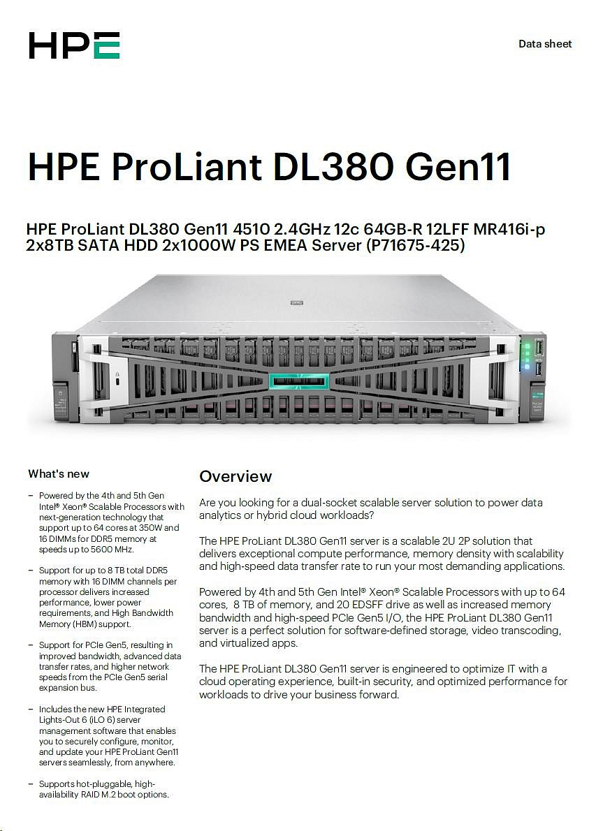 Model Name HPE PL DL380g11 4510 (2.4/12C/30M) 2x32G 2x8TB 2x1000W MR416i-p 12LFF 4x1Gb NBD333 2U