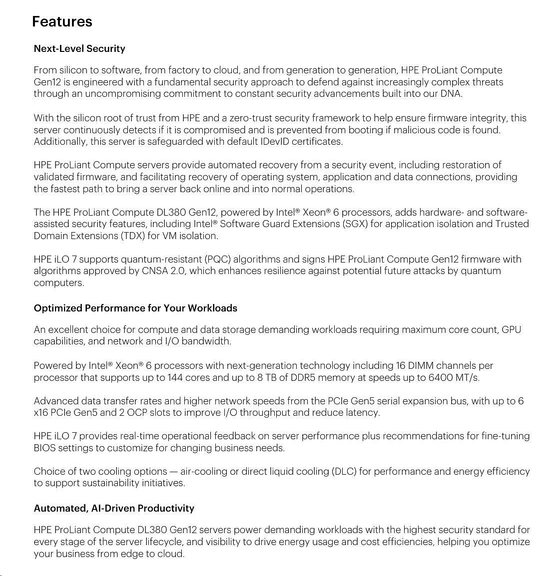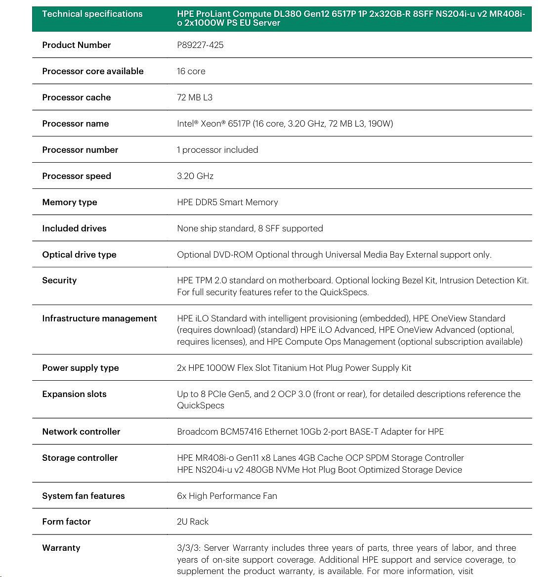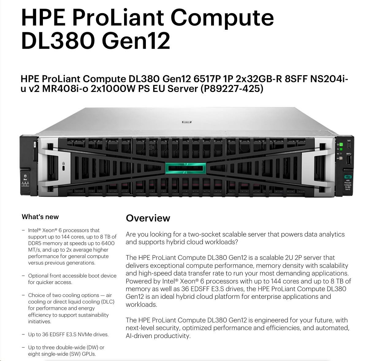 Popis HPE PL DL380g12 6517P (3.2-4.2G/16C) 4x32G (P69727) 8SFF NS204i-uv2 MR408i-o 2x1000W 2p10T NBD333 Smart Choice