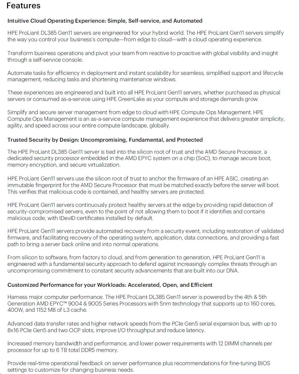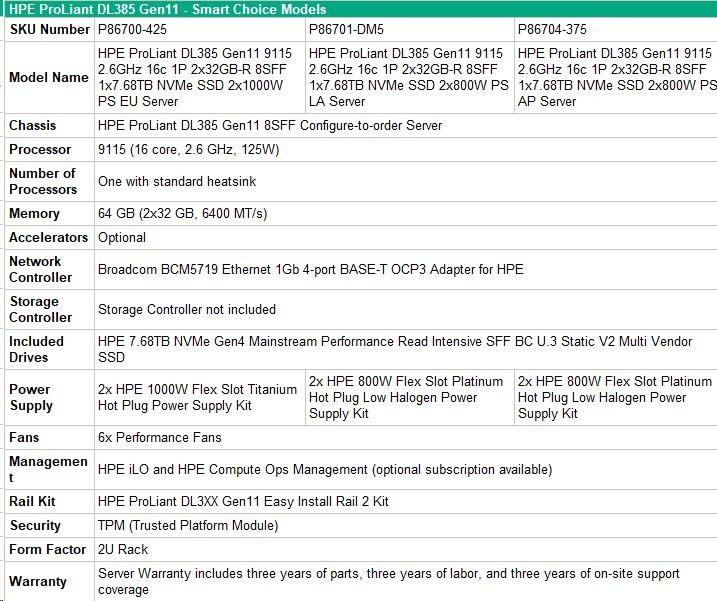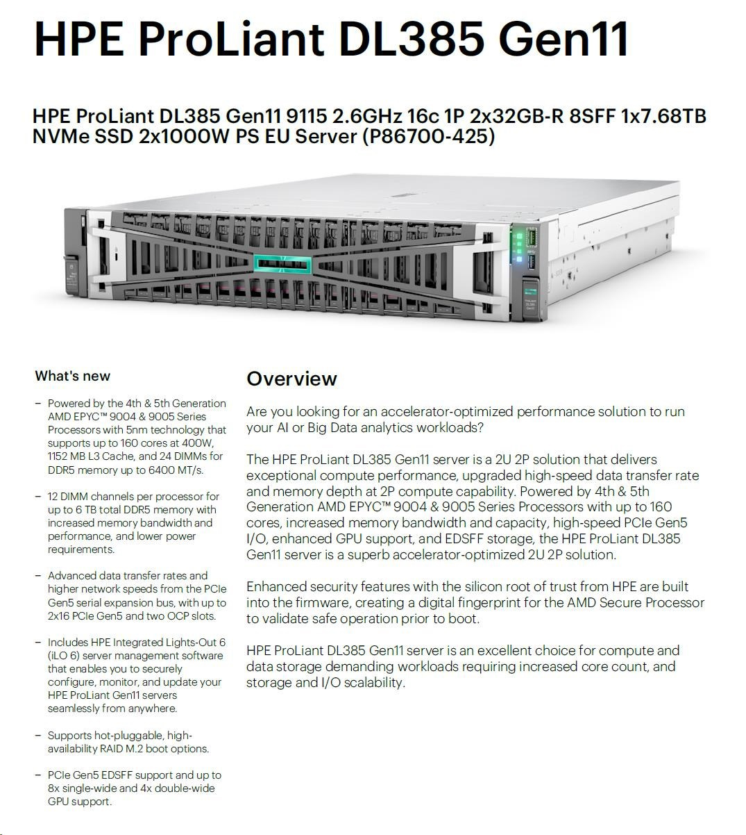 Popis HPE PL DL385g11 AMD EPYC 9115 (2.6/16C) 2x32G (P64985) 1x7.68TB NVMe 2x1000W 8SFF 2p10GT Smart Choice