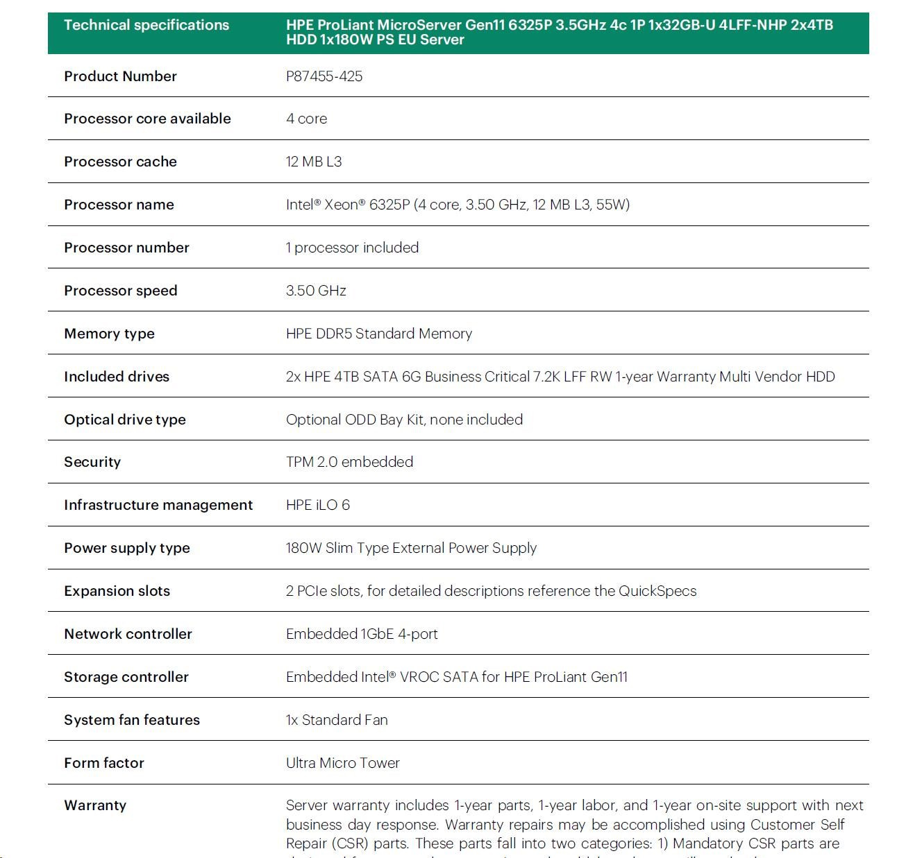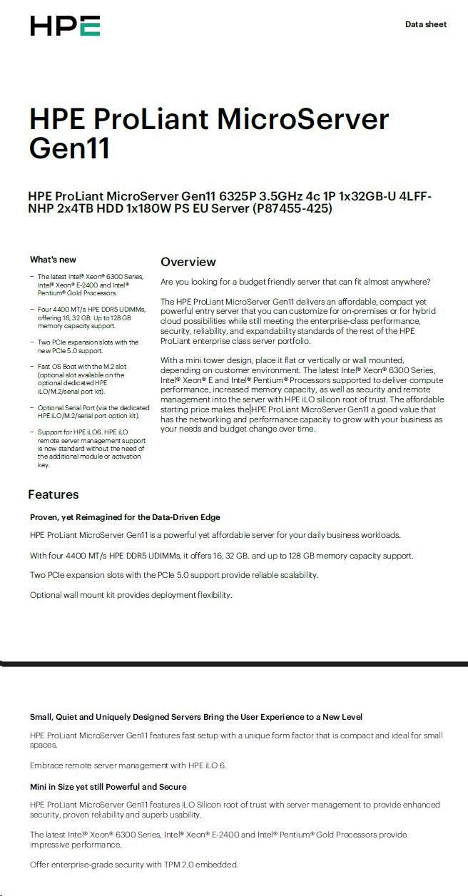 Popis HPE PL MicroServer Gen11 6325P (3.5/4C) 1x32G 2x4TB SATA 4LFF/SFF-NHP VROC 4p1G iLoPort (P65741) NBD111 Smart Choice
