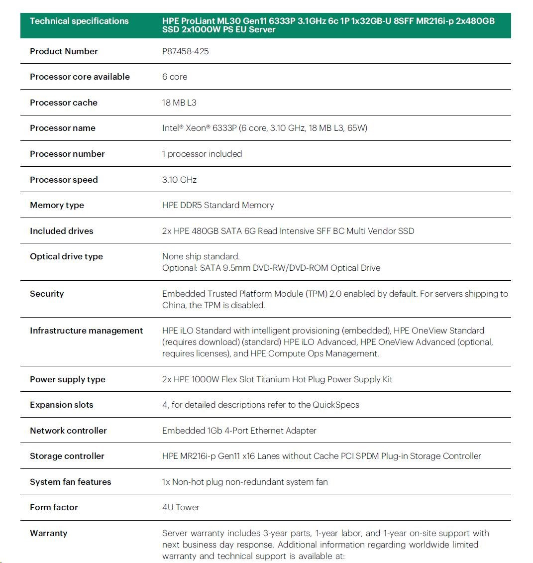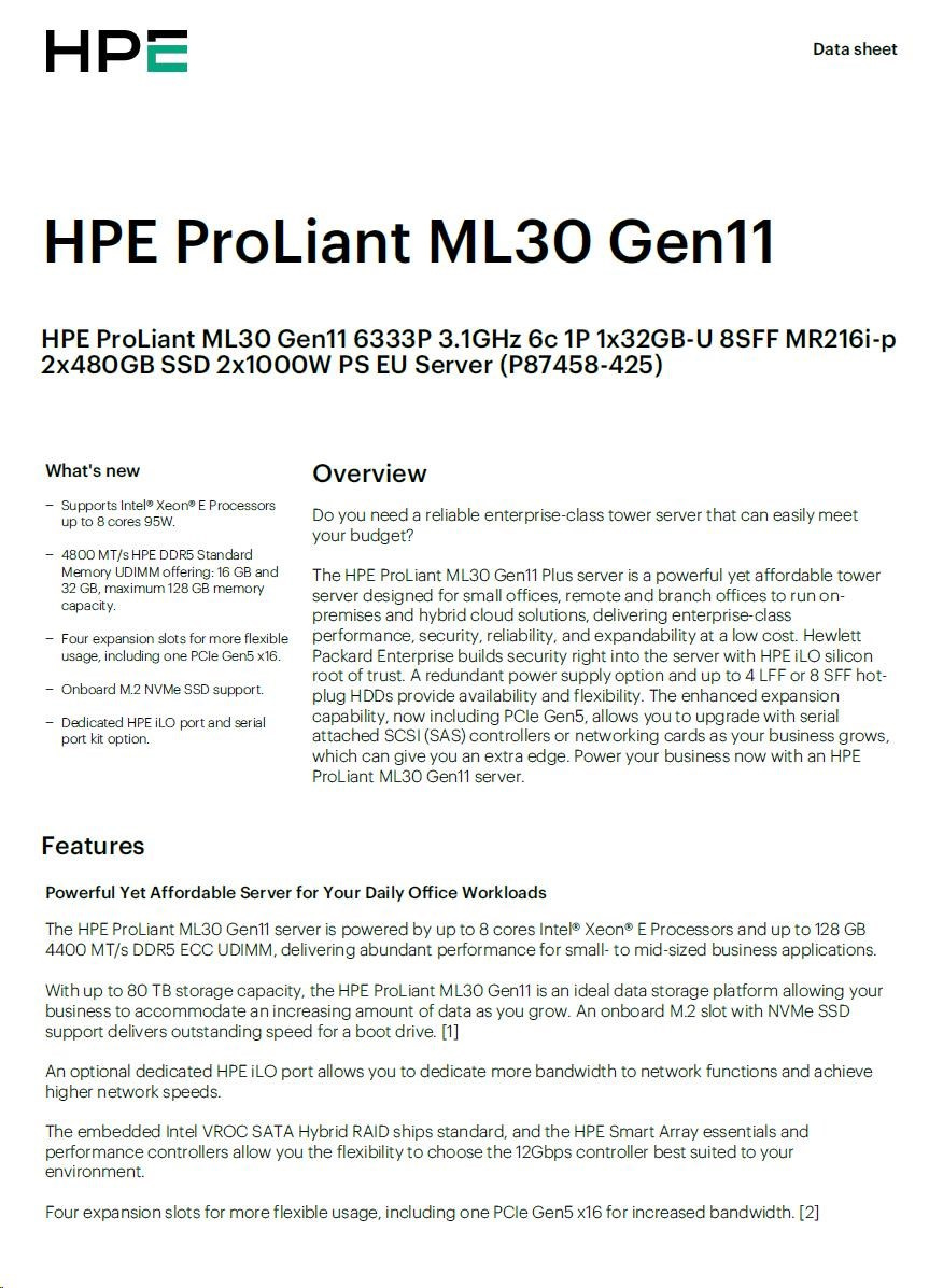 Popis HPE PL ML30g11 6333P (3.1G/6C12T/65W) 1x32G 2x480G 2x1000W MR216i-p 8SFF 4p1G NBD311 Smart Choice
