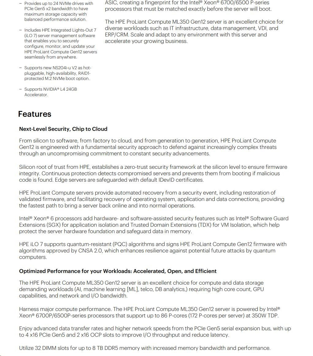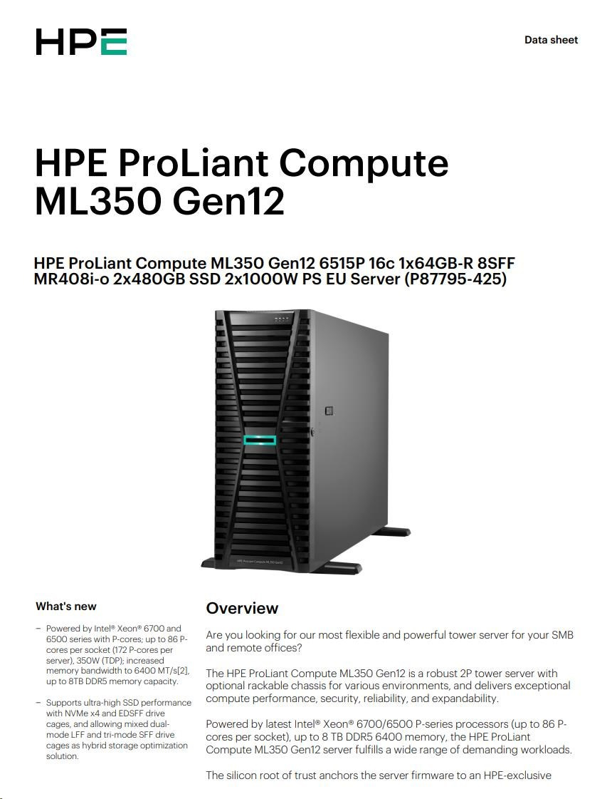 Popis HPE PL ML350g12 6515P (2.4/16C) 1x64G (P69728) 2x480G MR408i-o 8SFF 2x1000W 1GbE NBD333 Smart Choice