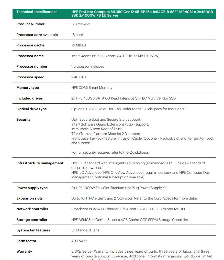 HPE PL ML350g12 6515P (2.4/16C) 1x64G (P69728) 2x480G MR408i-o 8SFF 2x1000W 1GbE NBD333 Smart Choice