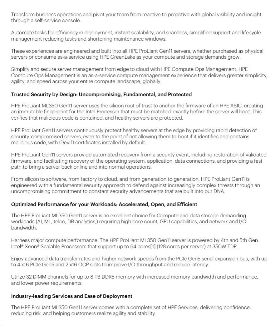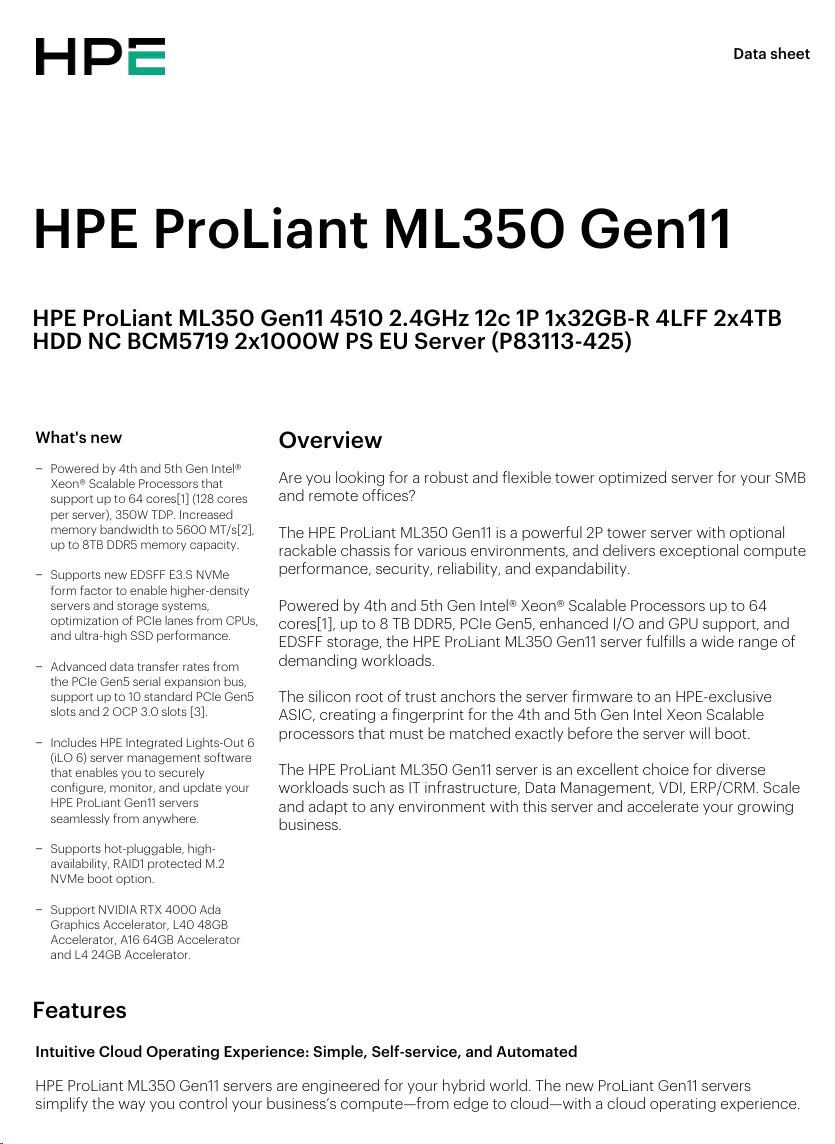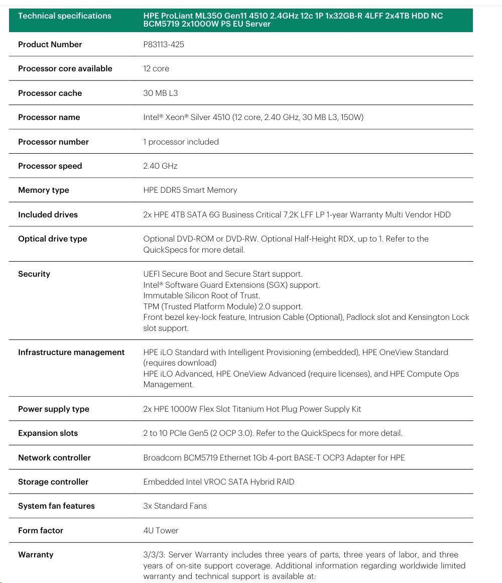 Popis HPE PL ML350g11 4510 (2.4G/12C) 1x32G (P64706) 2x4TB/7.2k SATA 4LFF VROC 2x1000W 4p1G Smart Choice