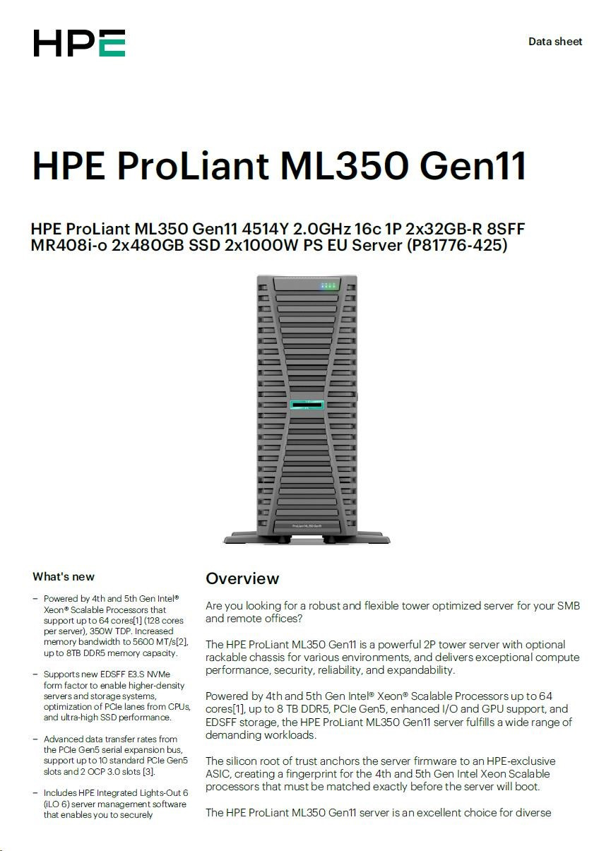 | Model Name | HPE ProLiant ML350 Gen11 4514Y 2.0GHz 16c 1P 2x32GB-R 8SFF MR408i-o 2x480GB SSD 2x1000W PS EU Server |