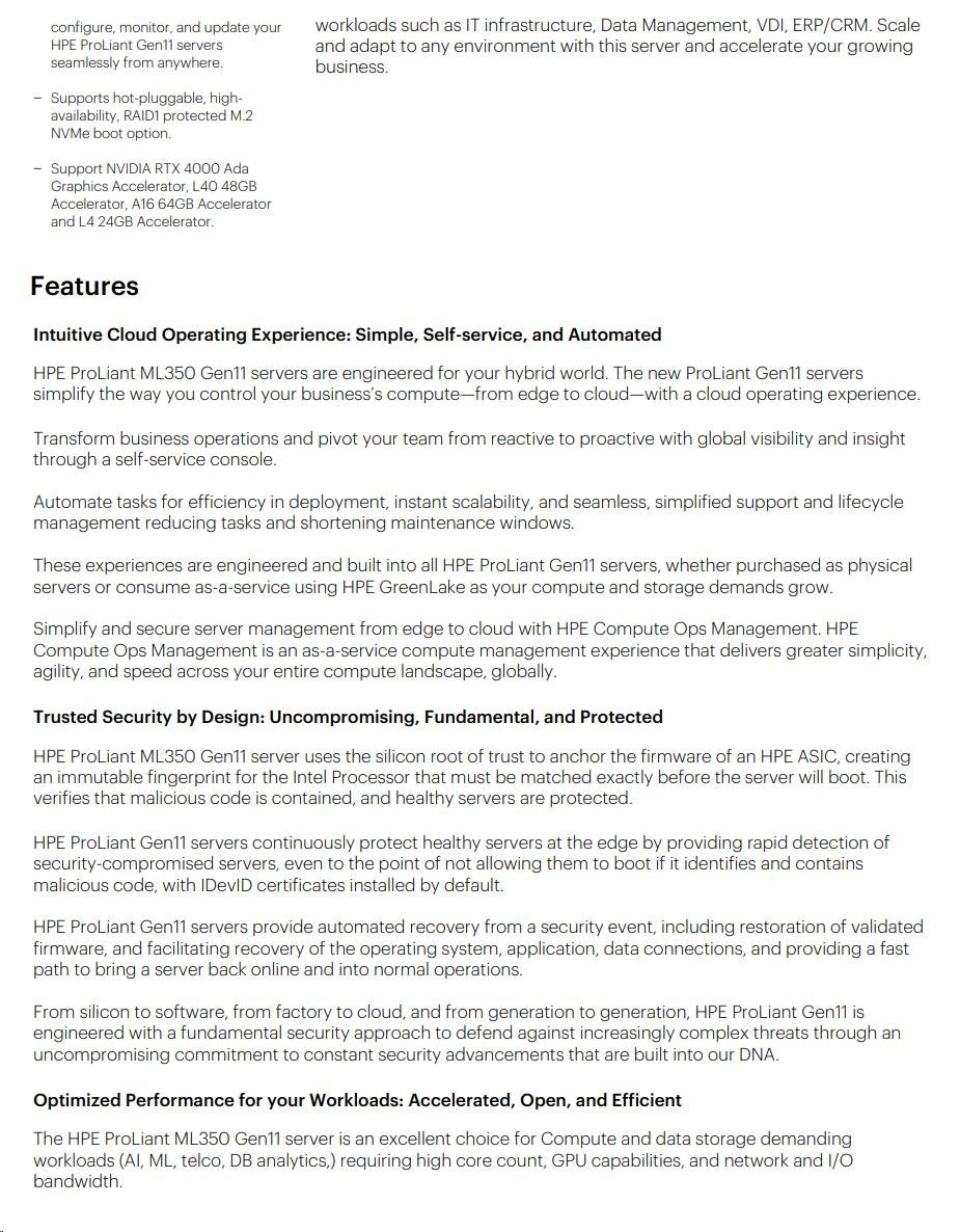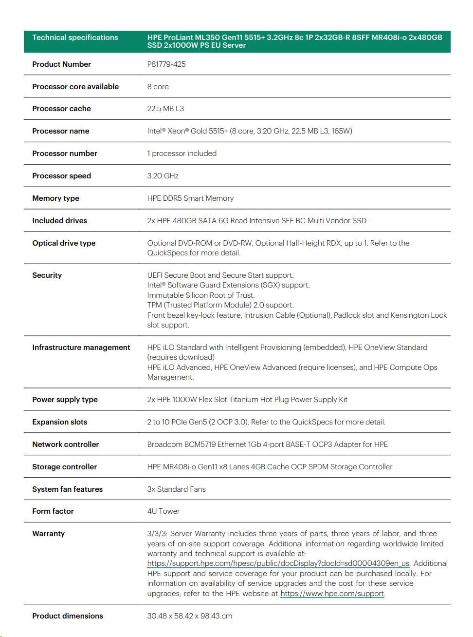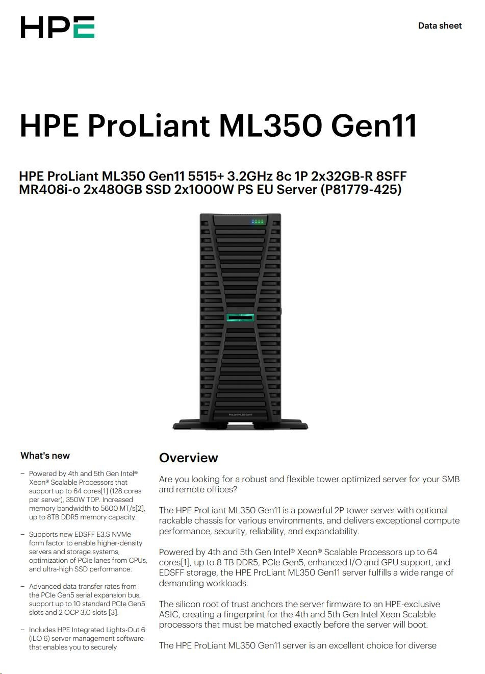 Popis HPE PL ML350g11 5515+ (3.2G/8C) 2x32G (P64706) 2x480G SSD MR408i-o/4G 2x1000W 8-24SFF 4p1G Smart Choice