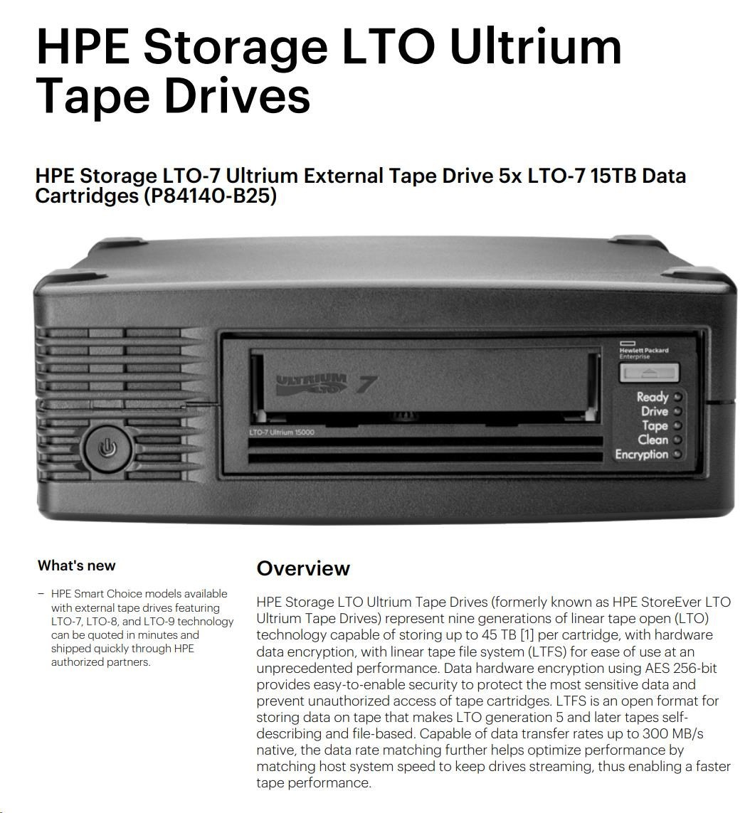 Popis HPE Storage LTO-7 Ultrium External Tape Drive 5x LTO-7 15TB Data Cartridges