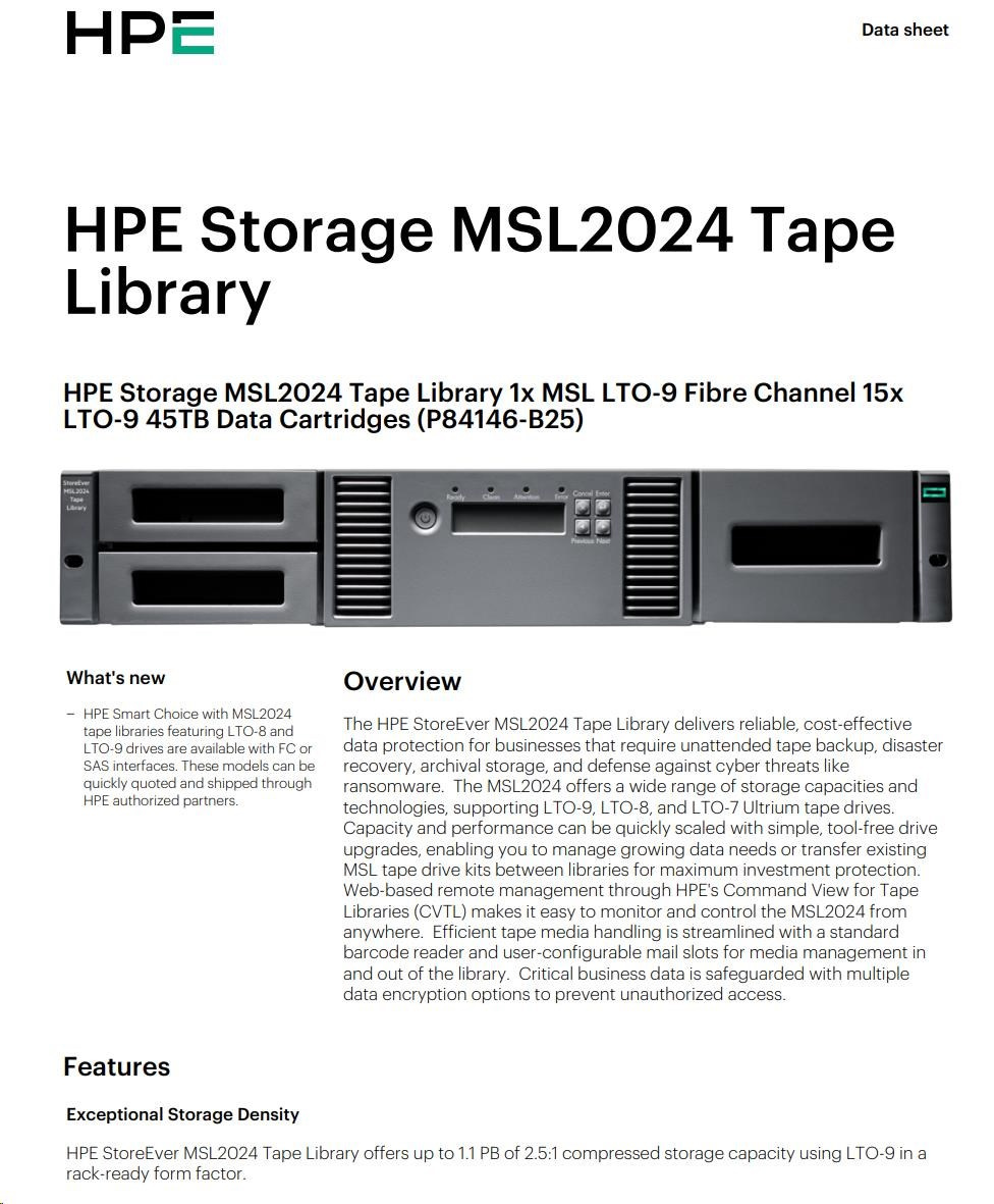 Popis HPE Storage MSL2024 Tape Library 1x MSL LTO-9 Fibre Channel 15x LTO-9 45TB Data Cartridges