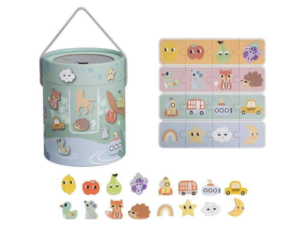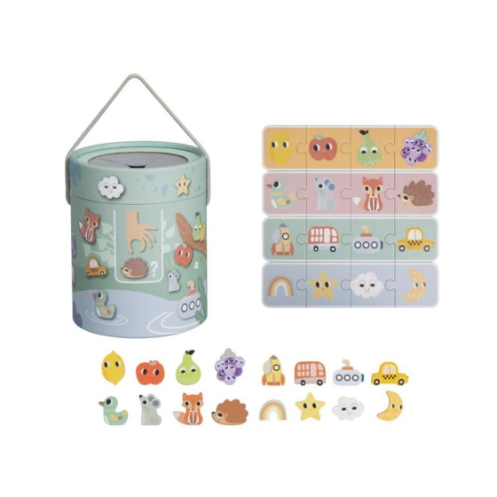 Společenská hra pro děti i celou rodinu Hmatej a najdi nabízí spoustu zábavy a možností ke hře. Hra, která dokonale potrénuje a zdokonalí motorické dovednosti, spočívá v hledání správného dřevěného předmětu v kyblíku, kdy pouze hmatem musí hráč najít požadovaný tvar. Hru můžete hrát různým způsobem a přizpůsobit ji věku i dovednostem každého hráče. Užijte si společné chvíle při hmatání a hledání zvířátek, dopravních prostředků a dalších tvarů..